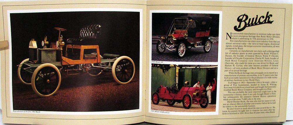 Original sales brochure showcasing 75 years of Buick greatness. With photos and description of beginning in 1903 through present day with the Electra and Regal. The inside back cover is clean; the one in photo has a dealer stamp. Very good condition.