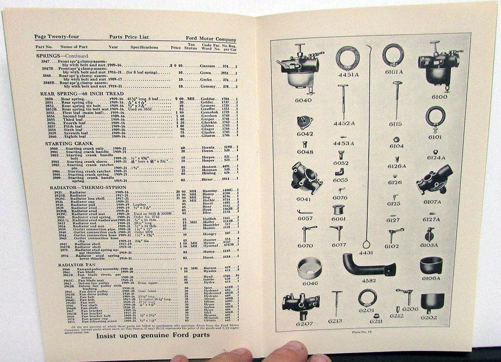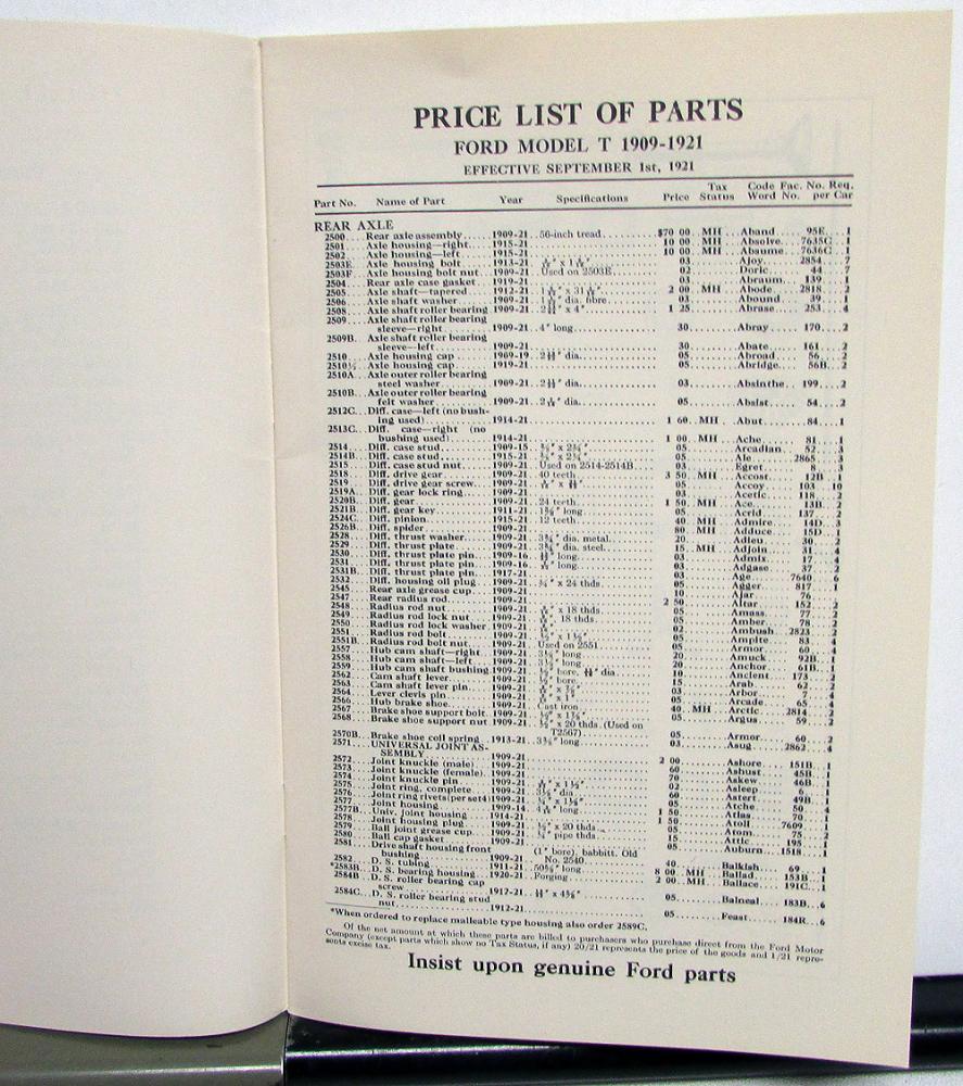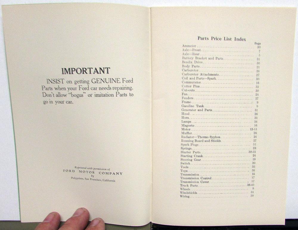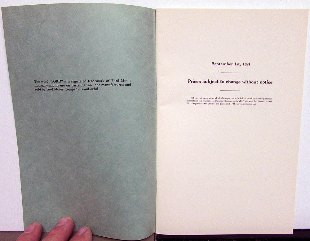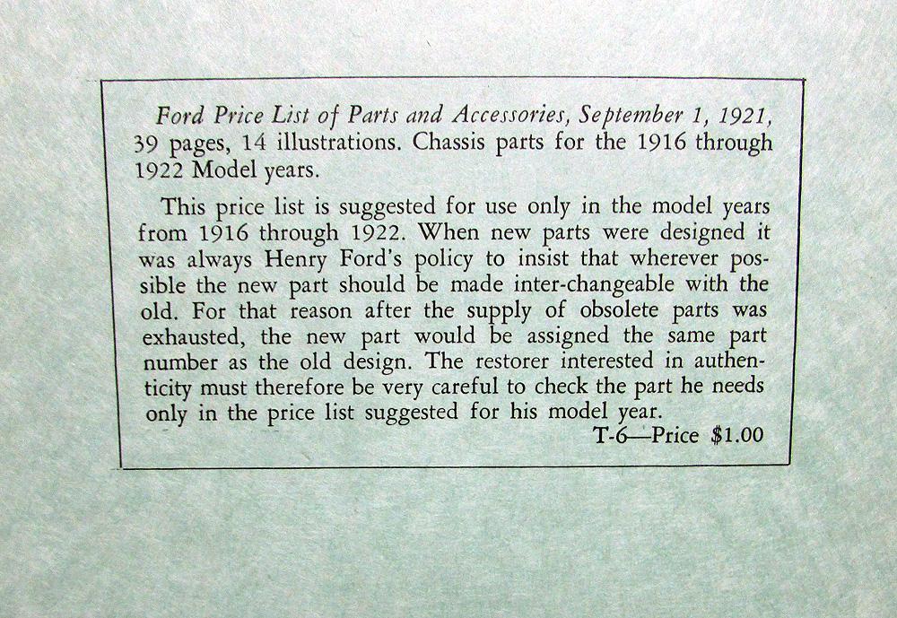 Vintage Reproduction 1909-21 Ford Price List of Parts and Accessories Booklet. This early reproduction is well done and in good condition with minor wear and discoloration [see photos]. Very informative and useful tool for the Model T Owner or Collector and will display well also.