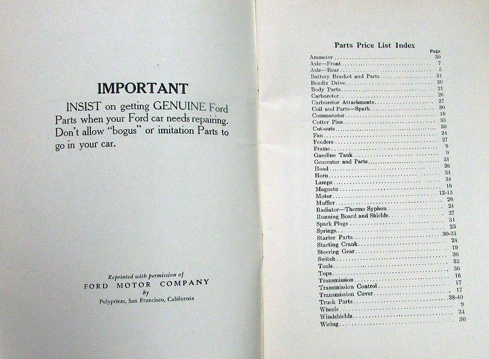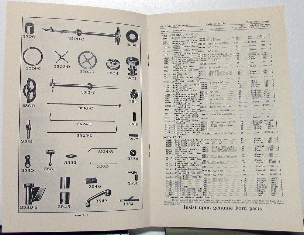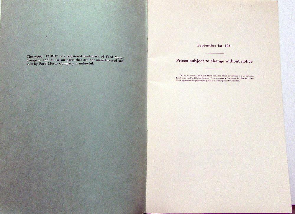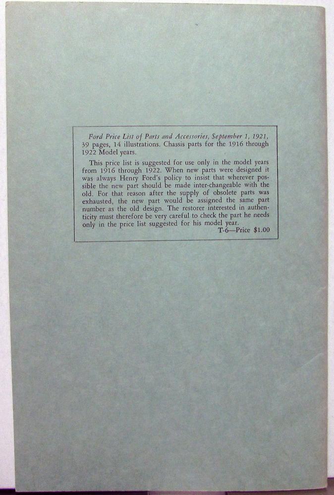 Reproduction, September 1, 1921 FORD Model T, price list of parts and accessories covering parts from 1909 through 1921 models. Illustrations have part number identifiers. Clean inside, very good condition.