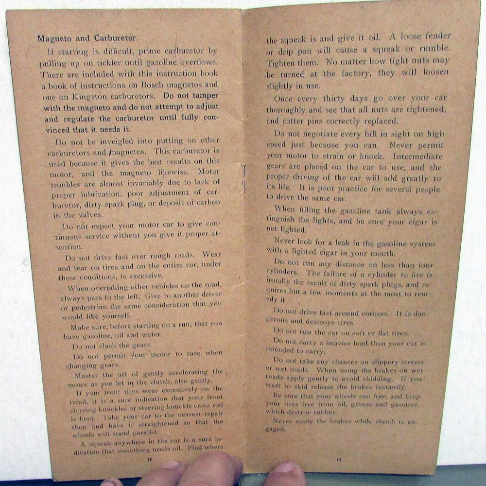 Original 1916 Detroiter Owner's Instruction Manual. This Manual has Care and Operation Instructions for the Cars built by the Briggs-Detroiter Company. It is in good condition for its age with minor wear and soiling [see photos]. Very rare and informative piece for the DetroiterOwner that will display well.