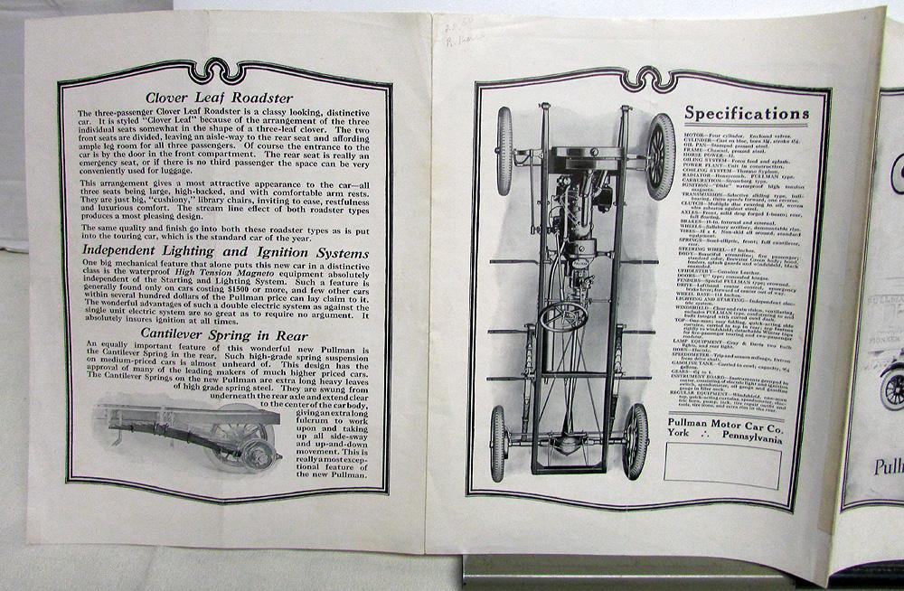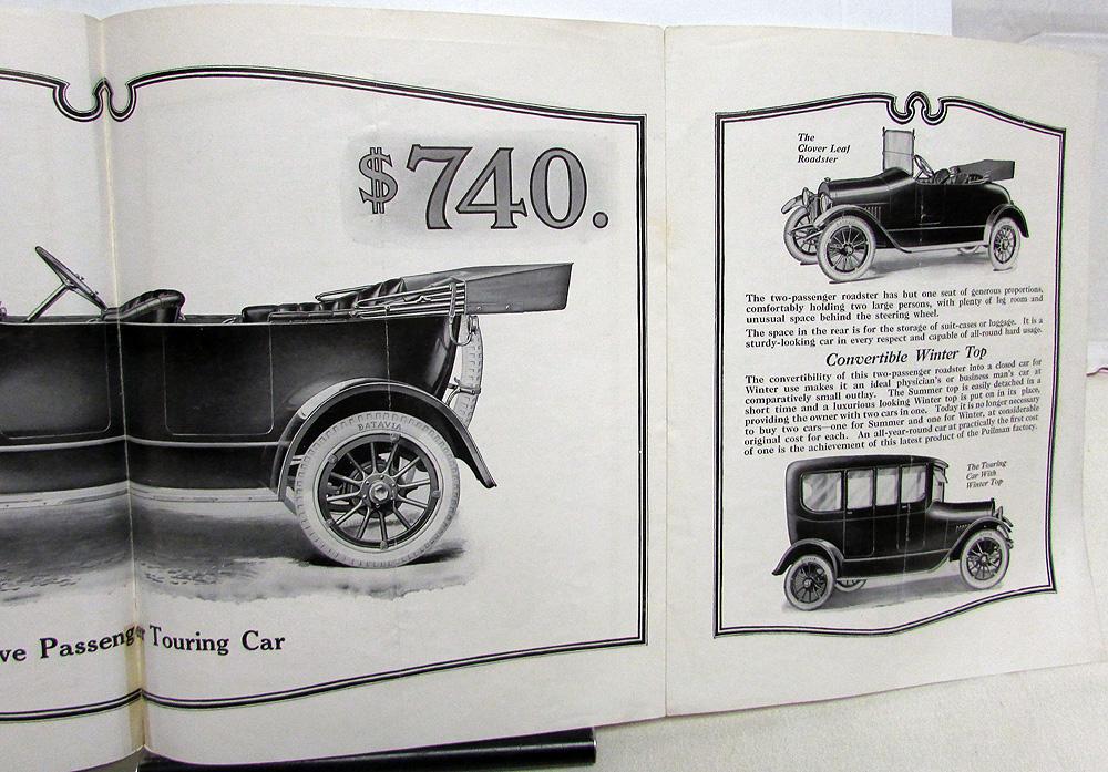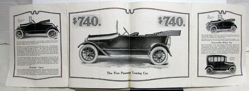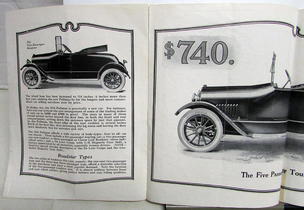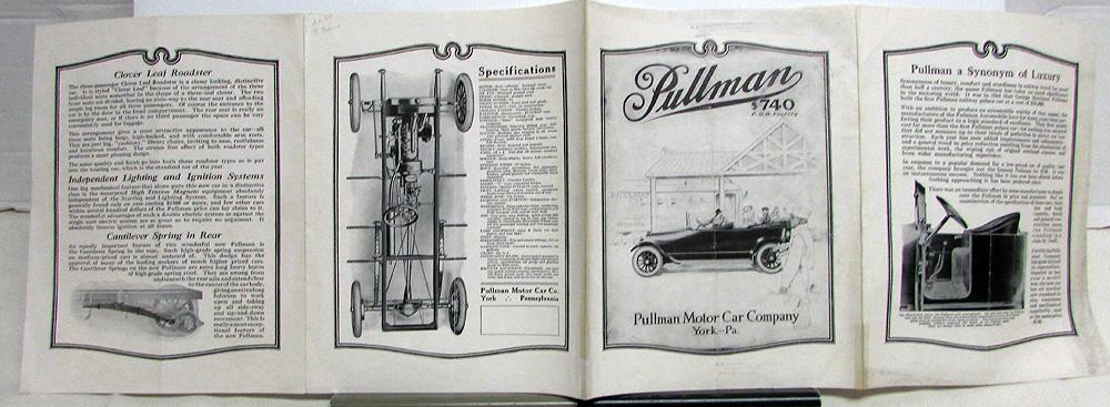 Original 1916 Pullman cars sales folder printed on one sheet of paper, double-sided with double gate fold. Eight panels/pages. Illustrations include 2-passenger Roadster, 5-passenger Touring, Clover Leaf Roadster, Touring car with winter top, as well as chassis and springs. Includes prices, features and specifications. Fair condition with some wear, soiling and blemishing [see photos]. The middle seam has been taped and other seams are weak. It is creased down the middle from being folded.