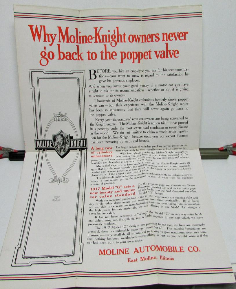 Original 1917 Moline Knight Dealer Sales Brochure. This large Folder highlights the Features and Specs of the G Models. It is in good condition with some wear and soiling. Some of the creases are weak. Very rare and informative piece of history that will display well.