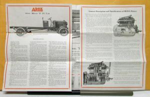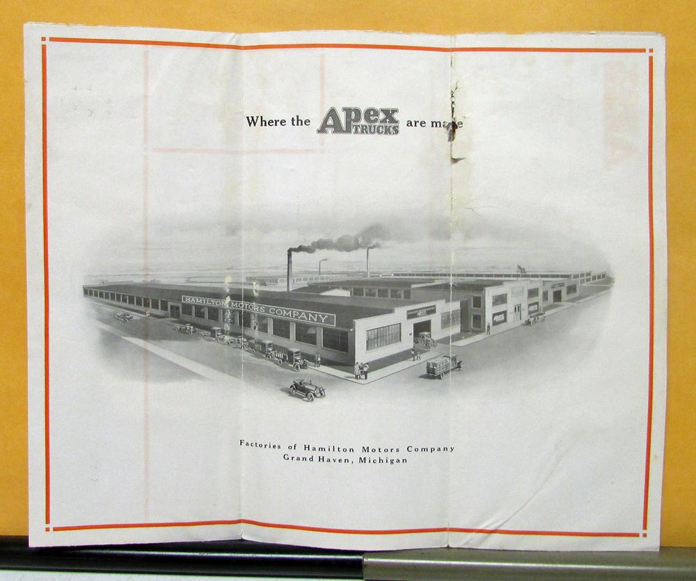 1921 Apex Truck Models E, G, F and D Sales Folder & Specifications. The front page show a nice illustration of an Apex truck. The inside pages show illustrations of each of the models with the most prominent being the Model F 3 1/2 Ton displayed on two of the pages. Each of the pages also have specifications to go along with the illustrations. The whole document is rough with some tears along folds and a hole on page 3. Also included with this 8 page folder is a 2 page advertisement from The Commercial Vehicle which talks about "Apex The Twin-Frame Truck".