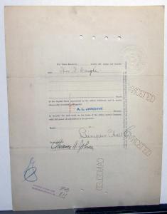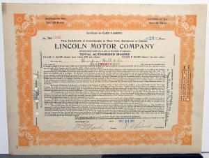 Original, memorabilia for Lincoln Motor Company Class A Certificate for Shares. This is an original, used, certificate for Lincoln Motor Company. Photos show the back side of the certificate as well. Dated Dec 24, 1921. No. TDO 6985. This certificate has been canceled and can not be redeemed or used to obtain current shares. Very cool piece of history that will make a great framed display item. Good condition for its age with minor wear and blemishing [see photos].