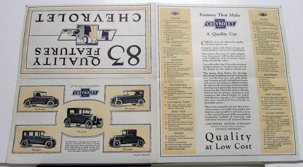 Original, 1925 Chevrolet 83 Quality Features list and illustrations, and illustrations of the Roadster, Sedan, Coach, Touring, and Coupe models. Two-sided printing on one-sheet of paper with a criss-cross fold. Good condition for its age with minor wear and blemishing [see photos]. Some tearing at seams.