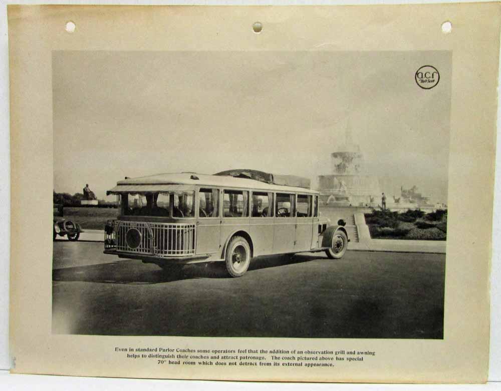 1927-1928 ACF Parlor Coach Bus with Observation Grill and Awning with 70" Head Room Photo Sheet. Condition: Some discoloration/yellowing from aging. Some tears/missing pieces along some edges. See pic.