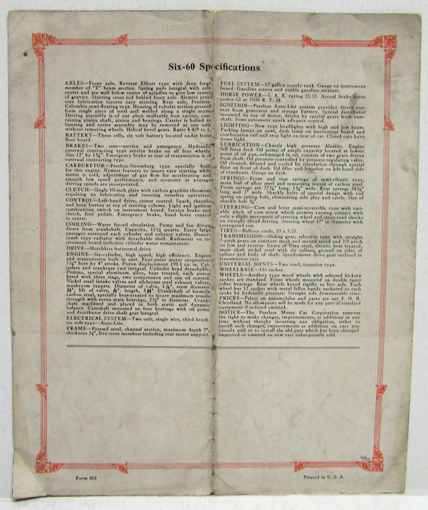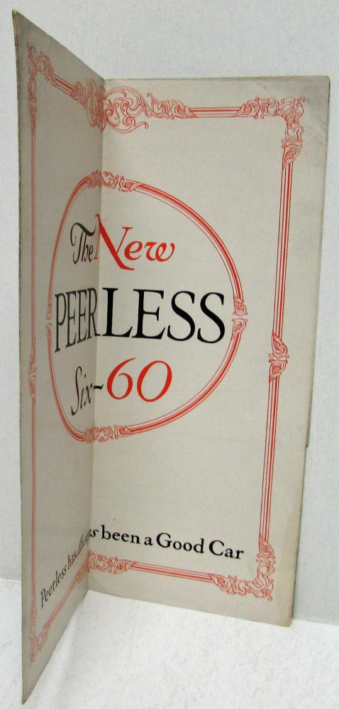 1927 The New Peerless 6-60 Sales Folder. Unusual values, even for the modern days of miracle motor car manufacturing, are offered in the new Peerless Model Six-60. Comfort, finish, appointment and performance hitherto expected only in expensive automobiles are here combined with convenience, quick acceleration, economy of operation and ease of handling typical of cars in the so-called light car class, at a truly light car price. Condition: A couple of holes have formed where seams meet. Some soiling. Dog ear bend on lower corners. See pics.
