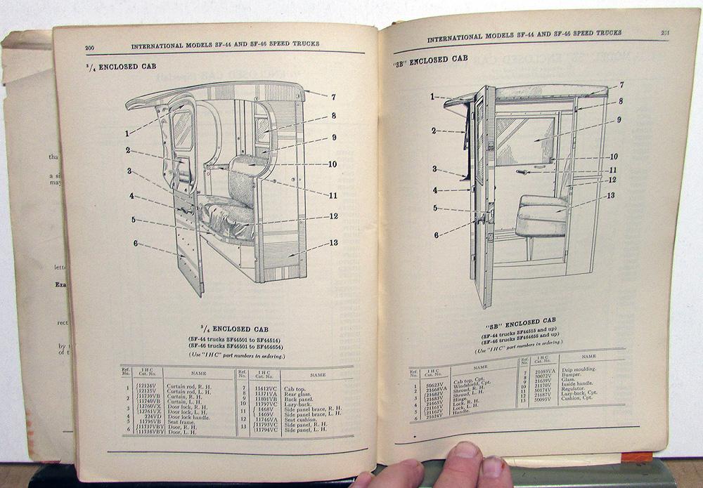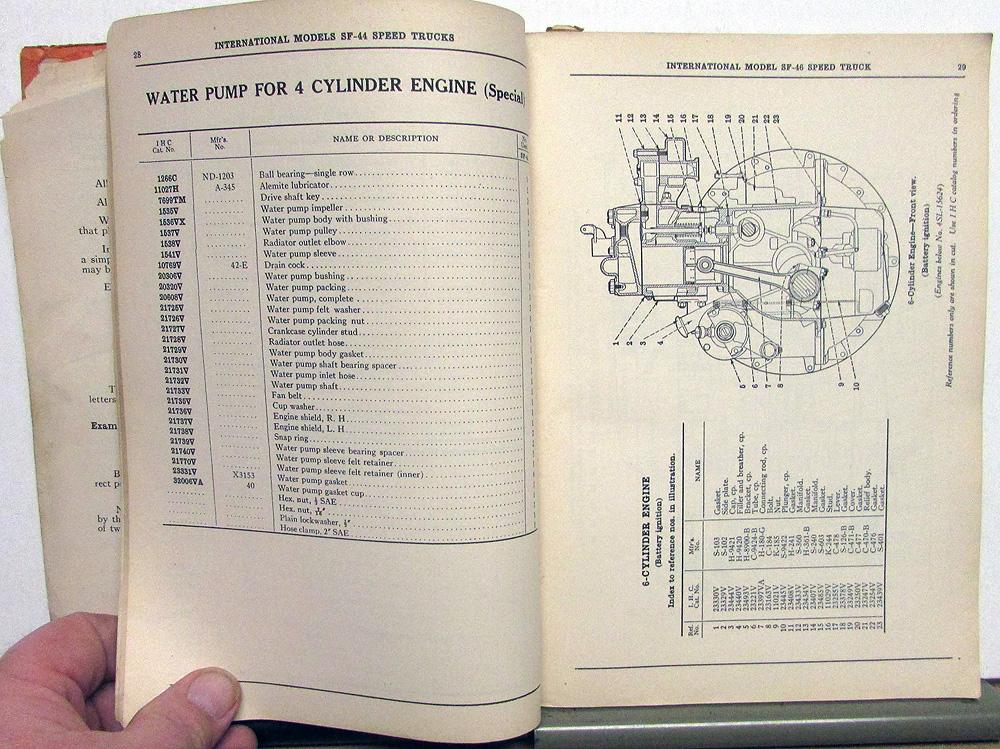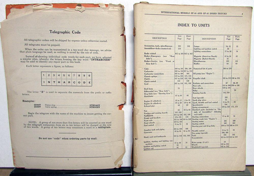 Original 1928-29 International Trucks Dealer Parts Catalog [MT-9-A]. This IHC Parts Book is what the Dealer used to order available Factory Replacement Parts to service and repair your International Speed Truck. It covers Model SF-44 [4 Cylinder] and Model SF-46 [6 Cylinder] Trucks, including Four-Wheel Brakes. This Catalog dated 12/28 has IHC and Mfr's Numbers, Description, Quantity and Illustrations for these Parts. It is very rare to find one of these very informative and useful Books from this time period. It is in fair condition with some wear and blemishing [see photos]. The front and back covers , along with the first and last couple pages are loose from the spine. While fragile, the Book is complete and the inner pages are pretty good.