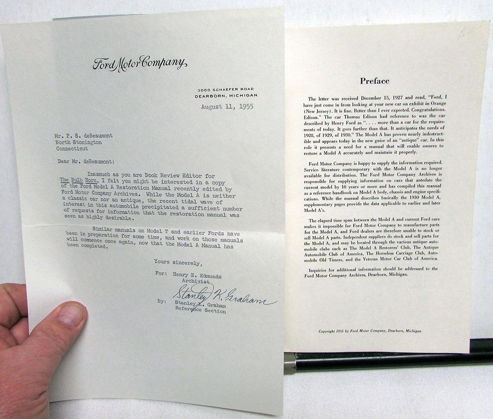 This manual is titled Ford Model A Restoration Manual and is in very good condition, see photos for reference. Full of diagrams, model numbers, body types, colors and so much more this manual is a must have for anyone who is looking to restore, is a admirer of this almost indestructible 1928-31 Model A, or is a motoring enthusiast in general! This Manual is dated 1955 and includes a Corporate Letter [see photo].