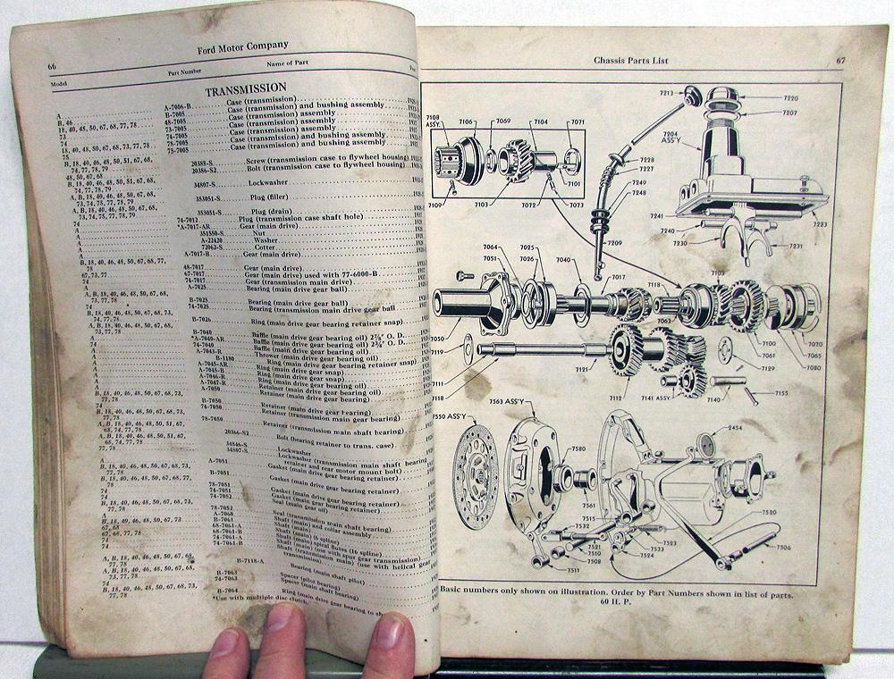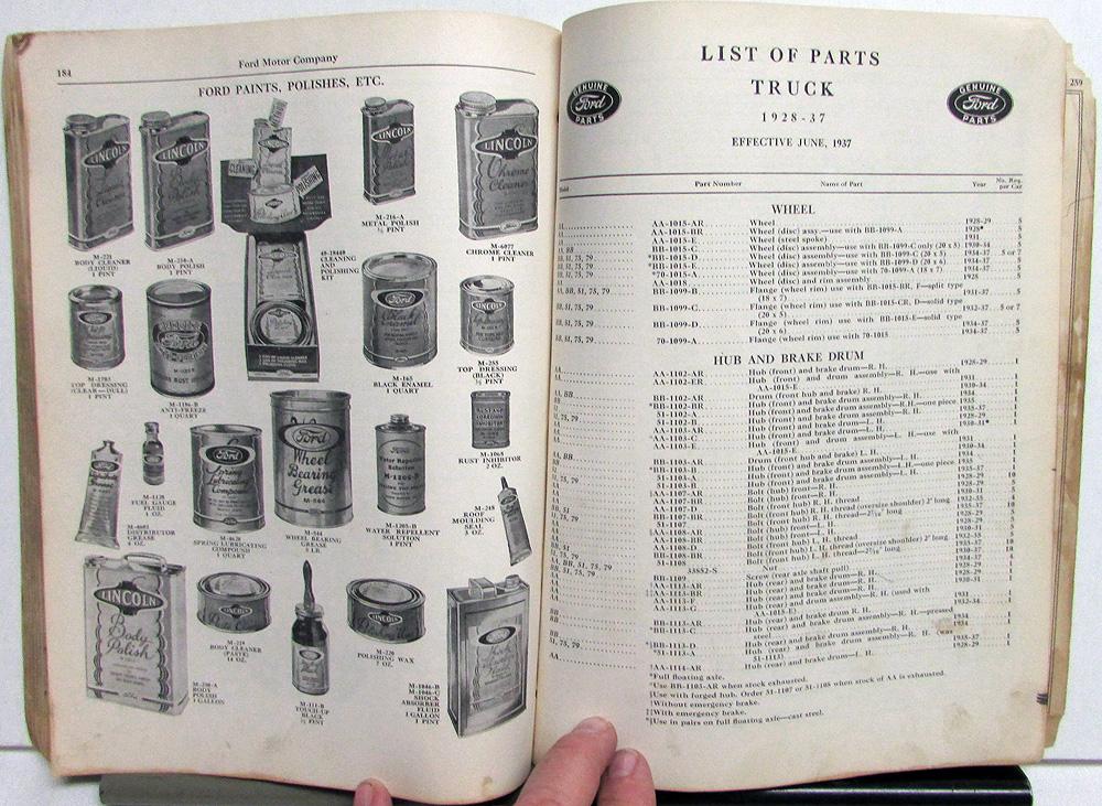 Original 1928-1937 Ford Dealer Chassis Parts List. This Dealer Parts Book is what they used to order available Factory Replacement Parts to repair your Car or Truck. It covers Chassis Parts for the Car and Truck Models from this period. It has Part Numbers, Descriptions, Application, Quantity and Illustrations. It is dated June, 1937. The front and back covers are missing as well as the first and last couple pages [all of the actual parts list pages are present]. Pages show some wear, blemishing and soiling but it will serve its purpose [see photos]. While not pretty, this rare Catalog will be an informative and very usefull tool for the Ford Owner or Enthusiast.