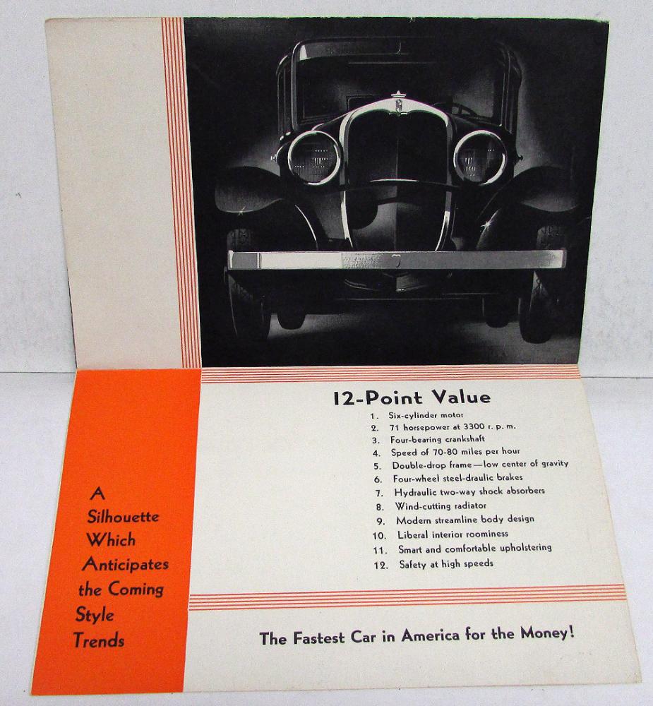 1931 Original sales brochure, one-piece paper, double-sided printing with two criss-cross folds. Illustration of the Five Passenger Sedan. Includes specifications. Features the 12-Point Value. Good condition with minor wear and soiling [see photos]. Front cover has a Dealer Stamp.