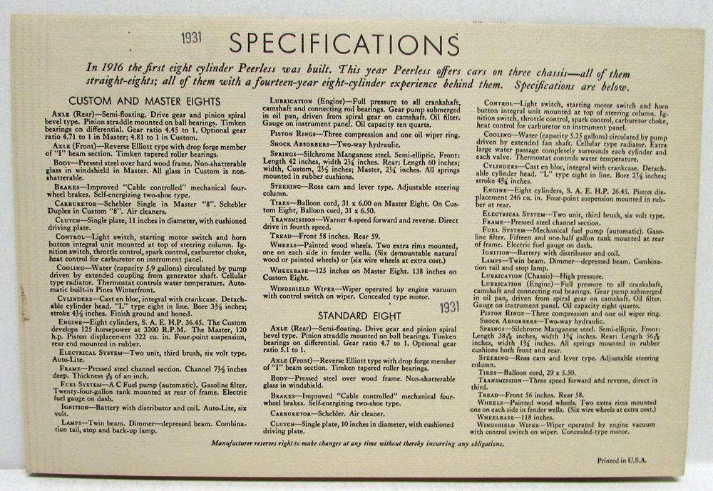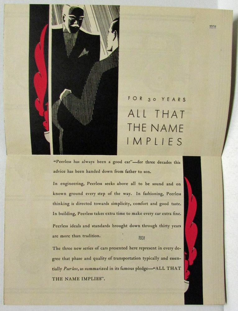 1931 Peerless Sales Folder. The New Peerless All That the Name Implies. Peerless has always been a good car -- for three decades this advice has been handed down from fatehr to son. In engineering, Peerless seeks above all to be sound and on known ground every step of the way. In fashioning, Peerless thinking is directed towards simpliciity, comfort and good taste. In building, Peerless takes extra time to make every car extra fine. The three new series of cars presented here represent in every degree that phase and quality of transportation typically and essentially Peerless, as summarized in its famous pledge - "All That the Name Implies". Features the Custom Eight, Master Eight, and Standard Eight with specifications on the back. Condition: Someone has written name in ink on cover.
