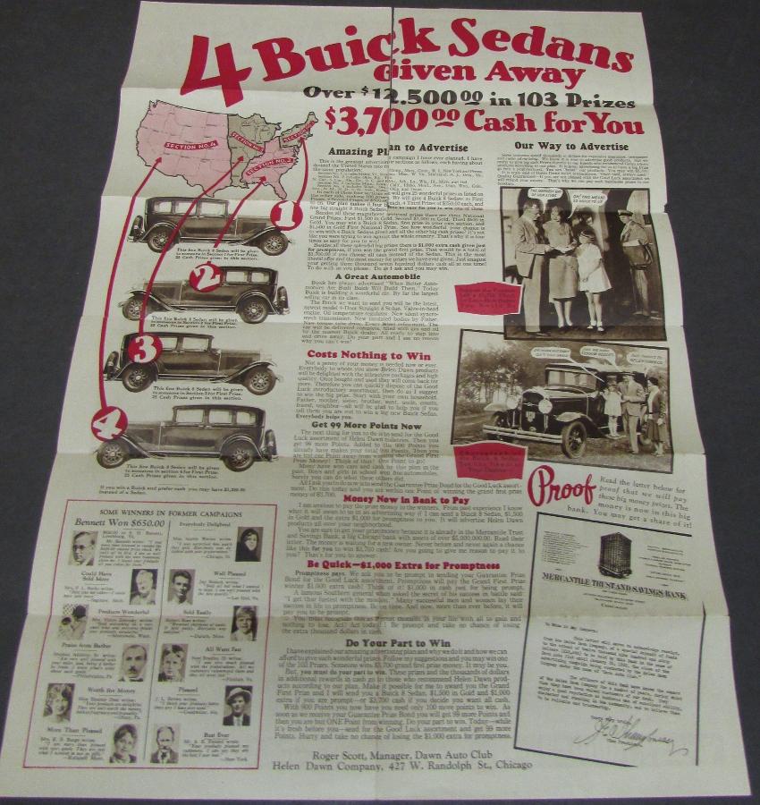 1932 Buick 8 Sedans Give-A-Way by Dawn Auto Club circular for an advertising campaign by Dawn Auto Club. Printed on two sides of one piece of paper. Paper is thin, and seams are very weakened/FRAGILE. Copyright 1931.