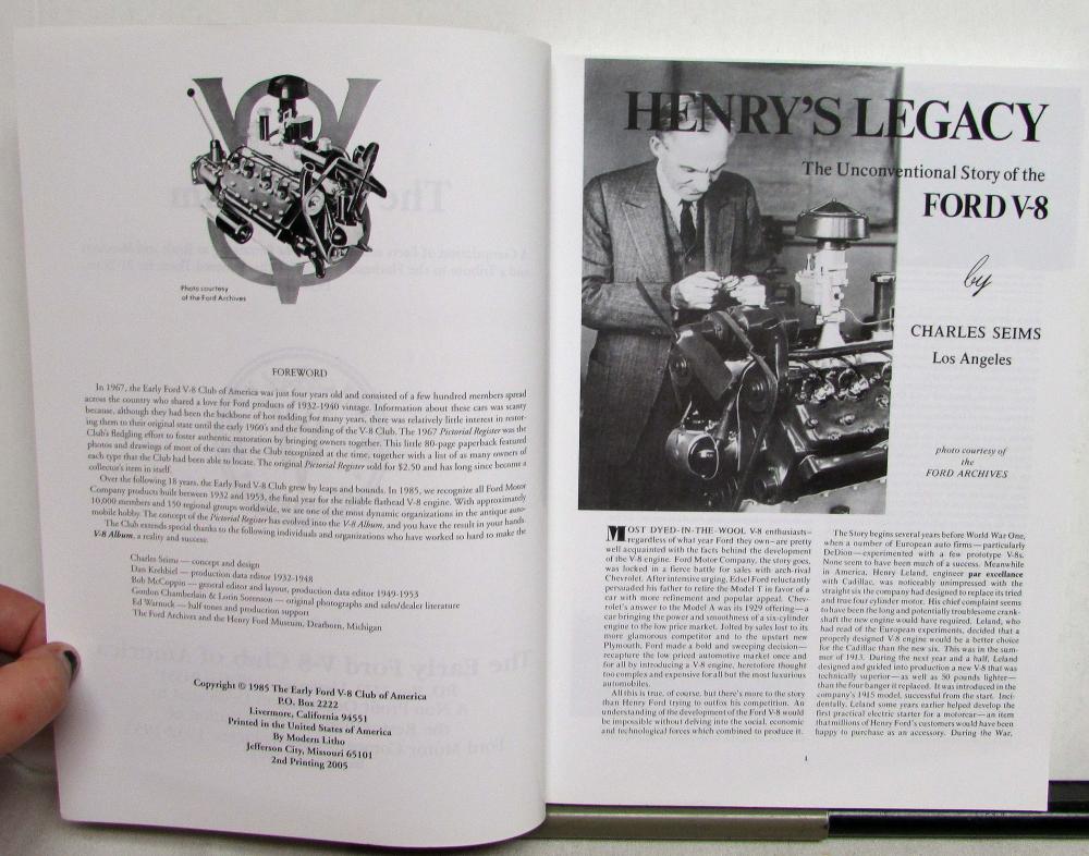 The V8 Album, by the Early Ford V8 Club of America. This book is a compilation of facts and photos pertaining to Fords and Mercurys and also a tribute to the Flathead V8 engine that powered them for 21 years, 1932-1953. This book is in good condition with very minor signs of wear, see photos for reference.