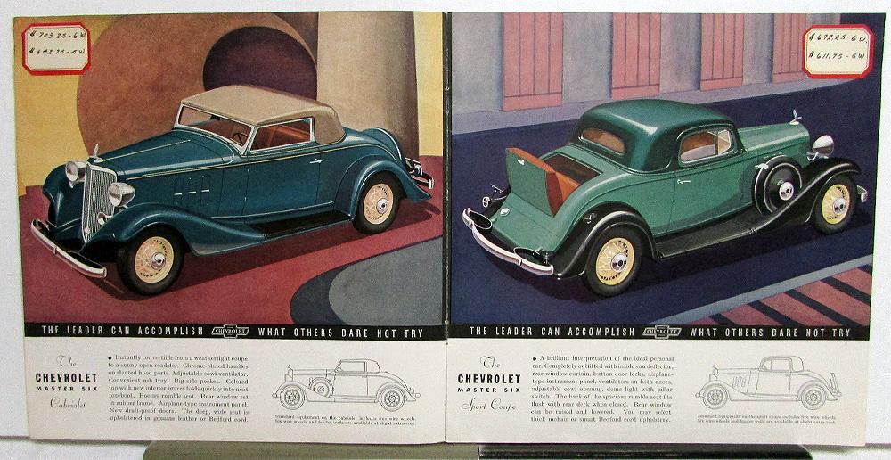 Original, 1933 Chevrolet Master Six and Standard Six color, sales brochure . Models/styles illustrated with caption description include: Sedan, Coach, Coupe, Cabriolet, Sport Coupe, Town Sedan, Sport Roadster, Phaeton, Coach, Coupe and Standard Six Coupe with Rumble Seat. List of new features (starterator, syncro-mesh shift, and more). It is in good condition with minor wear, soiling and blemishing [see photos]. The front cover has a date sticker and Return To Blackboard Room stamped on it. There is also a Pricing Sticker above each Car Model. Very rare and informative piece of automotive history that will display well.