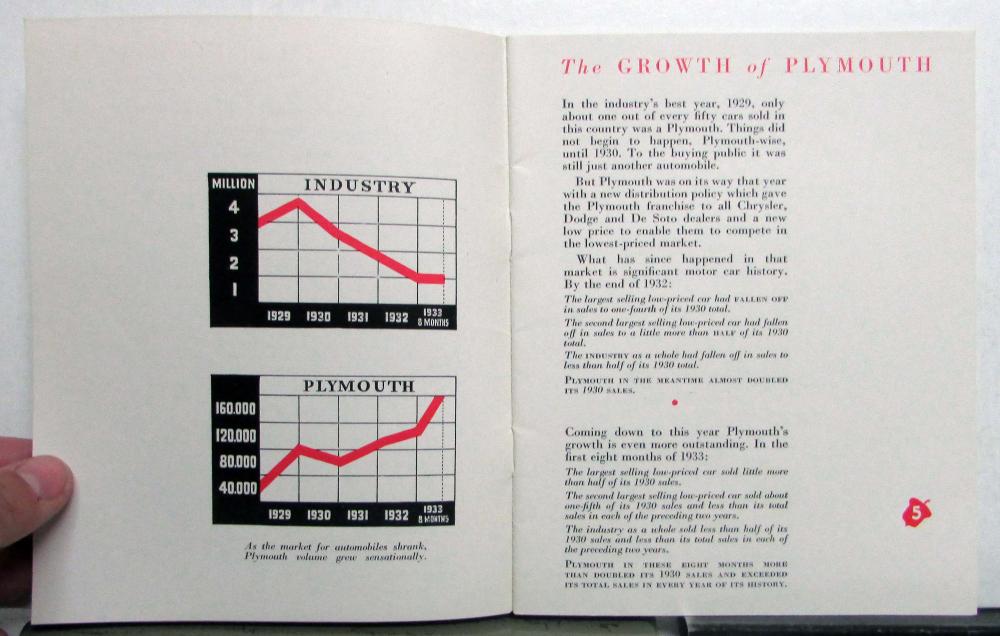 This is an original 1933 booklet for Plymouth featuring the growth throughout the ages and history. This was made to easily present nice photos, lots of history, and more to the consumer. This is in good condition, however, might have some signs of wear or age, see photos for reference. This is a great piece and would make a great addition to any collection!