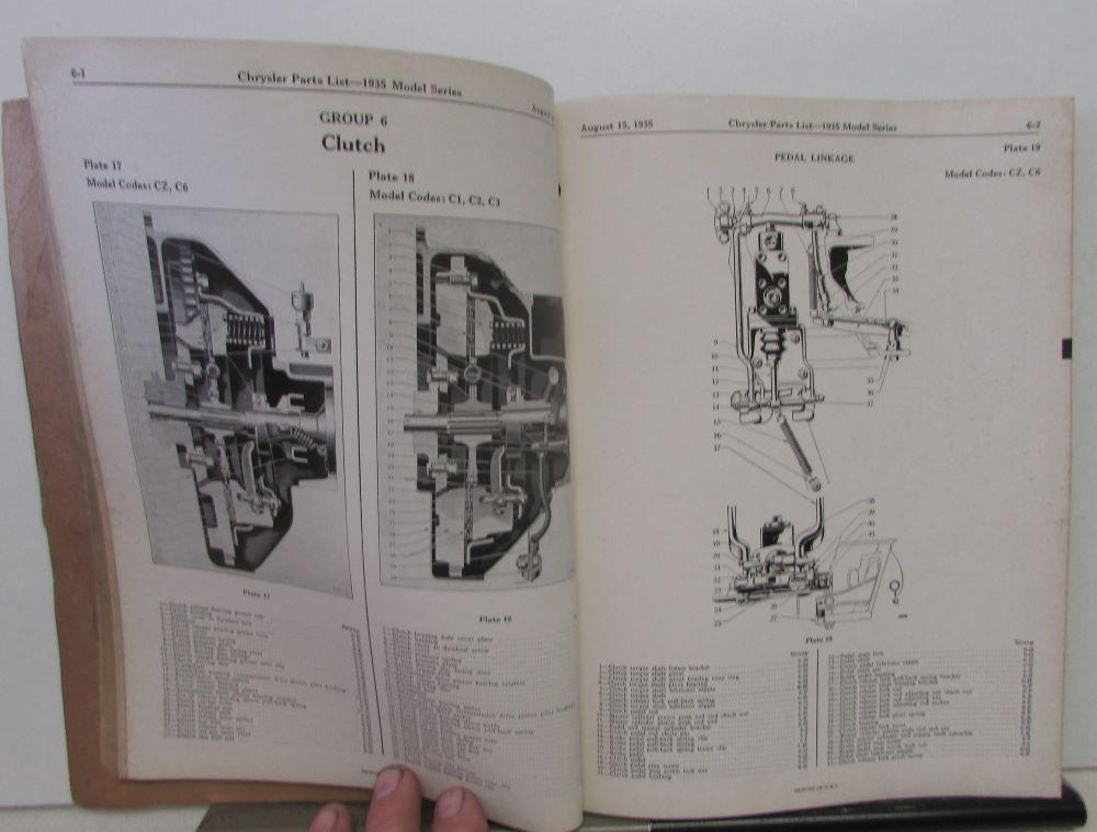 Original 1935 Chrysler Dealer Parts List [issued August 15, 1935]. This Parts Book is what the Dealer used to order available Factory Replacement Parts to repair your CZ, C1, C2, C3 or C6 Chrysler Car Model. It has Part Numbers, Description, Application and illustrations for these Replacement Parts.