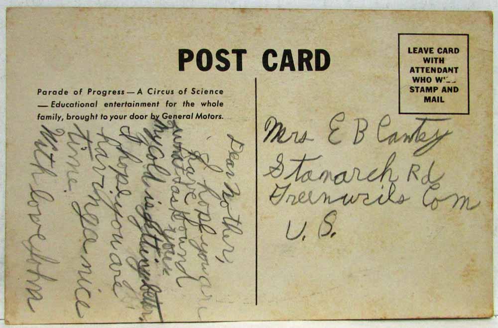 1936 General Motors (GM) Parade of Progress on Location Postcard. The General Motors "Parade of Progress" was a large, multi-faceted road show that began touring across America in 1936. It represented an investment of millions of dollars and thousands of man hours.