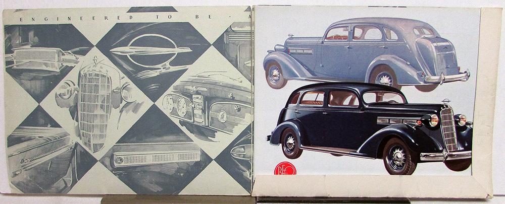 Original 1936 REO Flying Cloud Six sales portfolio with 4 color plates printed on cardstock. One side has an illustration of a car model, and the back has specifications. There is one plate that is non-color but highlights mechanical and chassis features. The car plates are: 4-door DeLuxe Sedan, 2-door Coach, 4-door DeLuxe Sedan (with trunk), and 2-door DeLuxe Brougham. Good condition for its age with minor wear, soiling and blemishing [see photos]. The Portfolio Folder is torn at the crease. Very rare piece that will display well.
