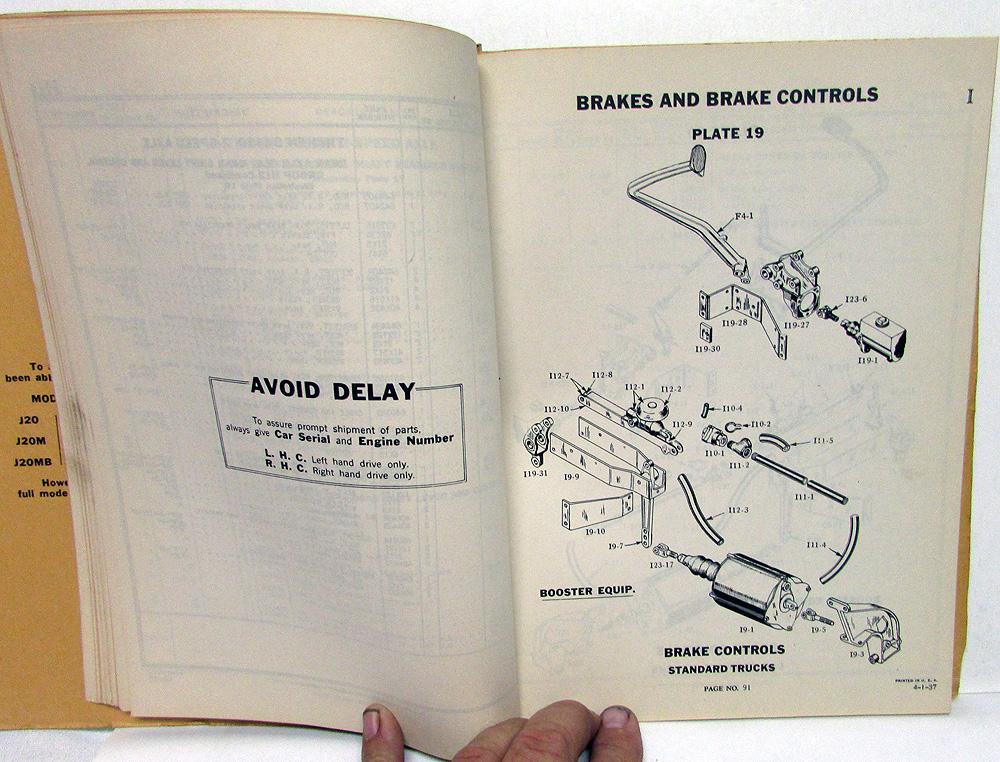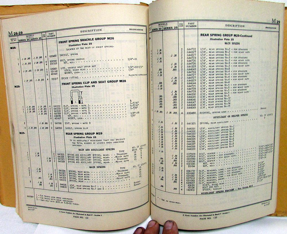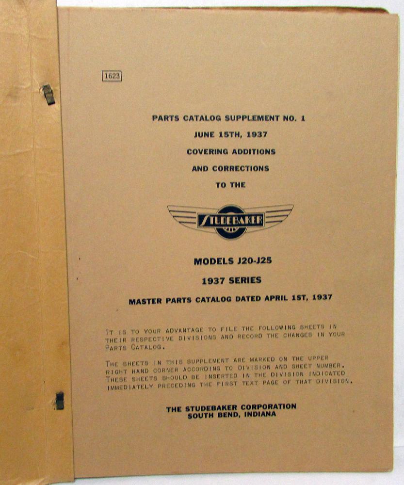 Original 1937 Studebaker Trucks Dealer Master Parts Catalog. This First Edition [April1, 1937] Parts Book covers the J20-J25 Truck Models [Standard, Cab-Forward and Bus Chassis]. This is what the Dealer used to order available Factory Replacement Parts to repair your Truck. It has Part Numbers, Description, Application, Quantity and Illustrations. Sections covered are: Engine, Oiling & Cooling, Gasoline, Electrical, Clutch & Trans, Pedals, Propeller Shaft, Rear Axle, Brakes, Steering Gear, Front Axle, Wheels, Frame, Exhaust, Sheet Metal, Instruments, Accessories & Tools, Cab Body Parts. It is in good condition with minor wear and soiling [see photos]. Very rare and useful tool for the Studebaker Owner or Collector.