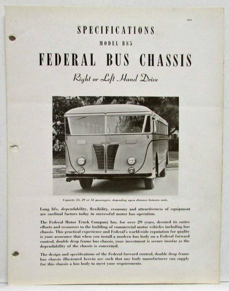 1938-1939 Federal Bus Chassis Specifications B80 and B85 plus Dimension Sheet and Price Sheet. Condition: Some soiling. Hole punched, some torn/stretched. Handwriting on Dimension sheet.