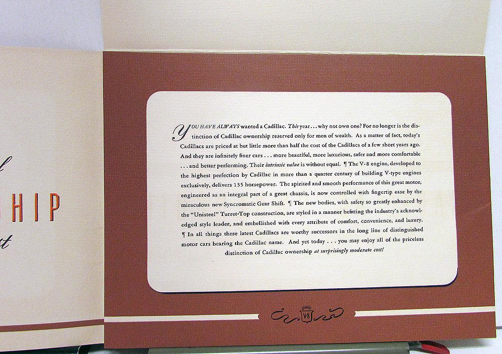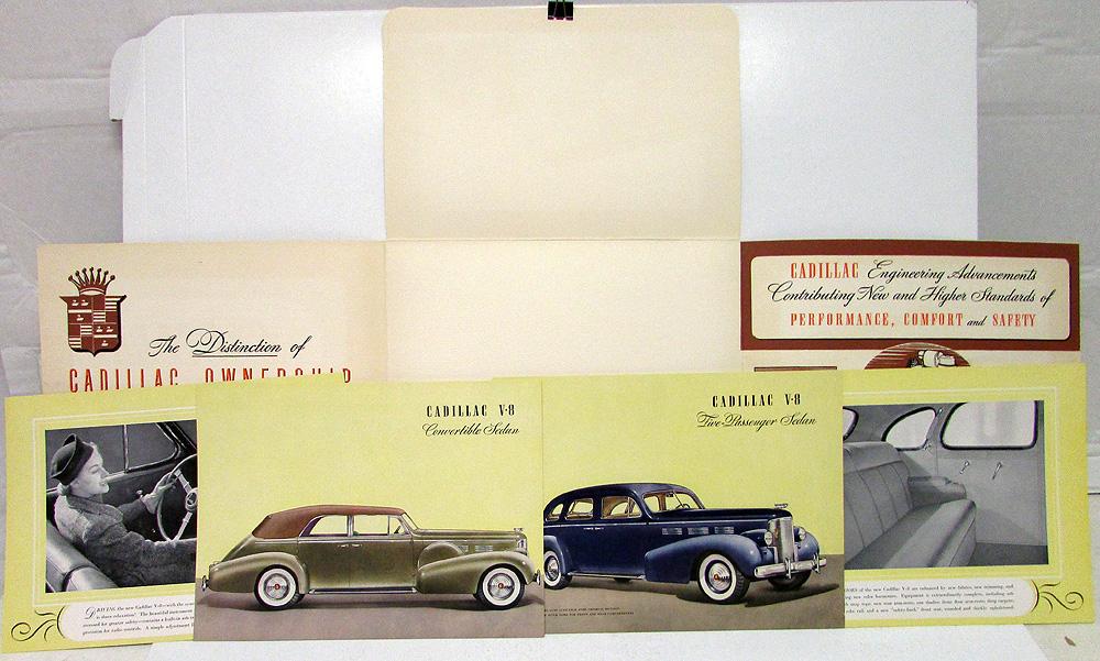 1938 Cadillac V-8, original, sales portfolio with 4 single-sided plates. Envelope has some age discoloration. Portfolio and plates are in very good condition. Cars with color illustration are the Convertible Sedan and five-passenger Sedan. Two interior plates.