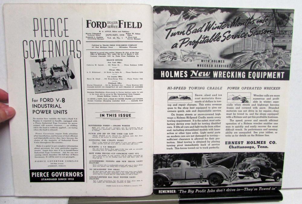 January 1938 issue of Ford Dealer & Service Field. These magazines came out monthly and are filled with articles, photos, ads, and more that would entertain the interests of Ford Dealers, service stations, garages, parts & accessories dealers, as well as enthusiasts, however, was not affiliated with The Ford Motor Company. This issue is in good condition however does have obvious signs of wear and age, see photos for reference.