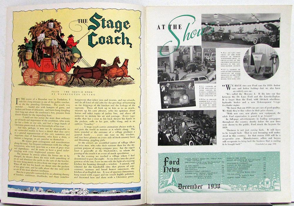 Original December 1938 issue of the FORD NEWS (includes table-of-contents) published by Ford and was sent to current and potential customers with emphasis on Ford vehicles and mostly what Ford is involved in, such as Ford promotion events, Ford's involvement in other countries, vehicle involvement in races (road and competition), Ford's efforts in health and schools, company news of the month, vehicles serving the public, and Ford's overall enthusiasm for moving the country forward. A sampling of contents: light-hearted bits of news, articles showcasing a particular vehicle (new or improved), Fordson Farms, Reminiscences of Menlo Park, oddities, dealership news, places to travel, and special going ons. In good condition, with soiling and wear, all pages are intact. Vol XVIII No 12