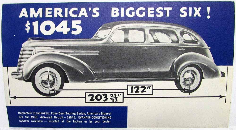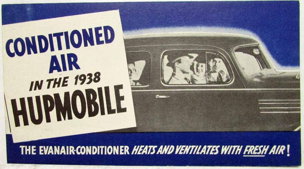 1938 Hupmobile Conditioned Air Sales Folder. Conditioned Air in the 1938 Hupmobile. The Evanair-conditioner heats and ventilates with fresh air (notice it does not say that it cools). Enjoy new health, comfort and safety in motoring with conditioned air in the 1938 Hupp. Back promotes America's biggest Six for $1,045. Very good condition.