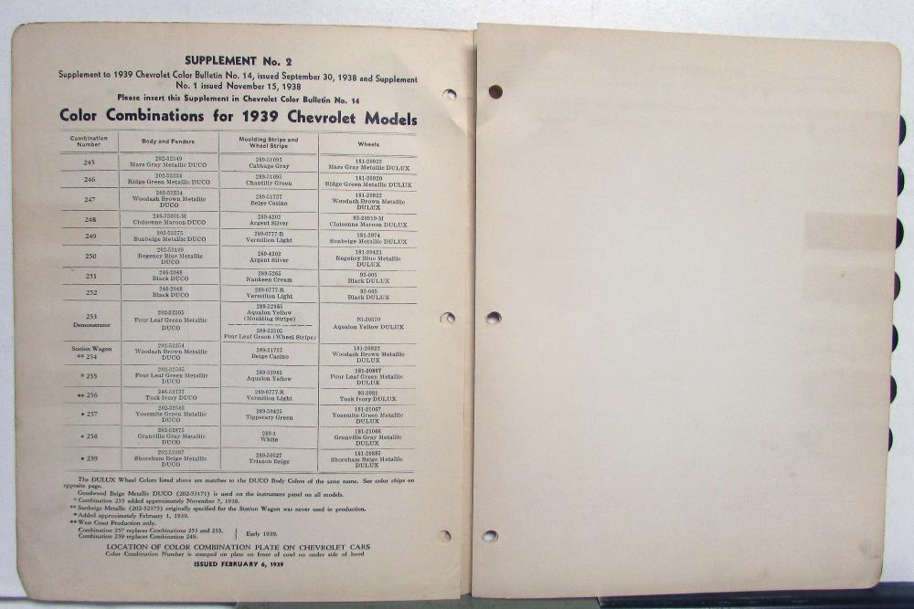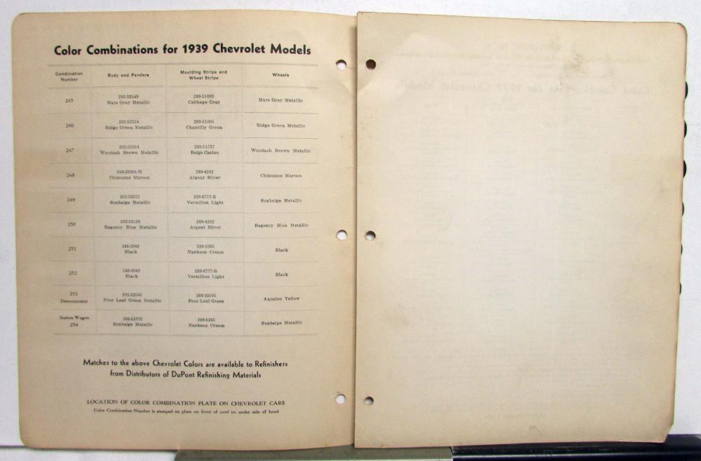 This is an original color bulletin that features the 1939 Chevrolet model's paint chips. It is in good condition, however, does have some signs of wear, etc, see photos for reference. This is a great piece of history and a must-have for any automotive enthusiast!