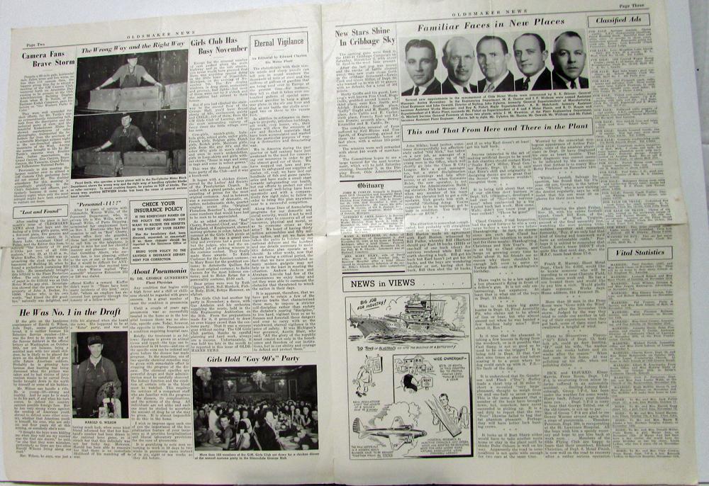 Original 1940 Oldsmobile's factory/employee monthly news publication "Oldsmaker News" volume 3, number 4, December 1940 issue. Contains factory and employee news, shop talk, classified ads, vital statistics, and much more, plus photos. There is tape on the side seam. There is a tear along the center crease about two inches.