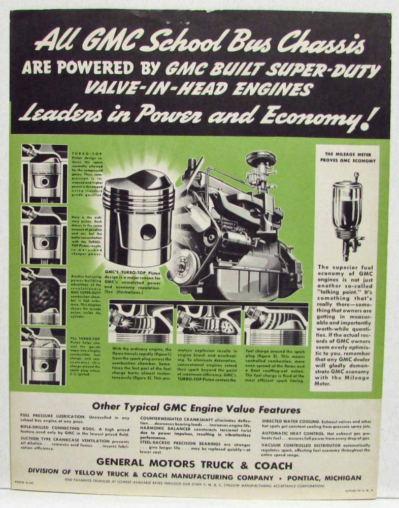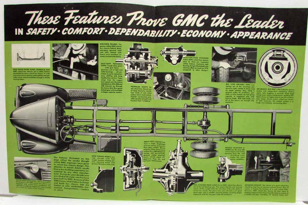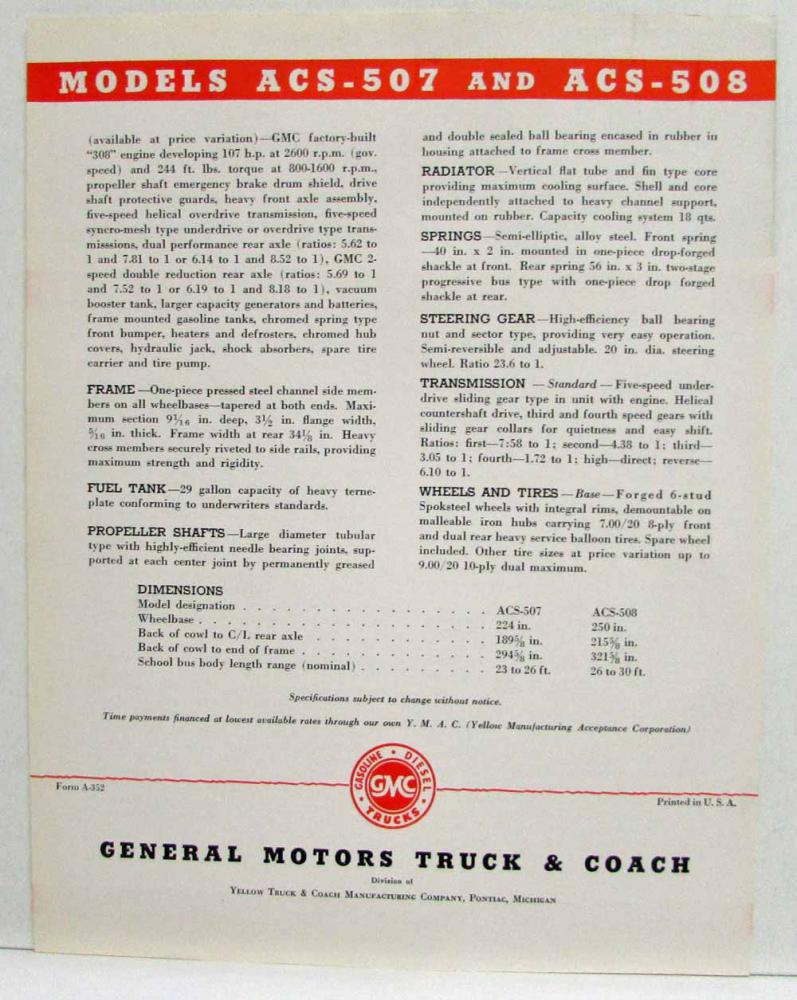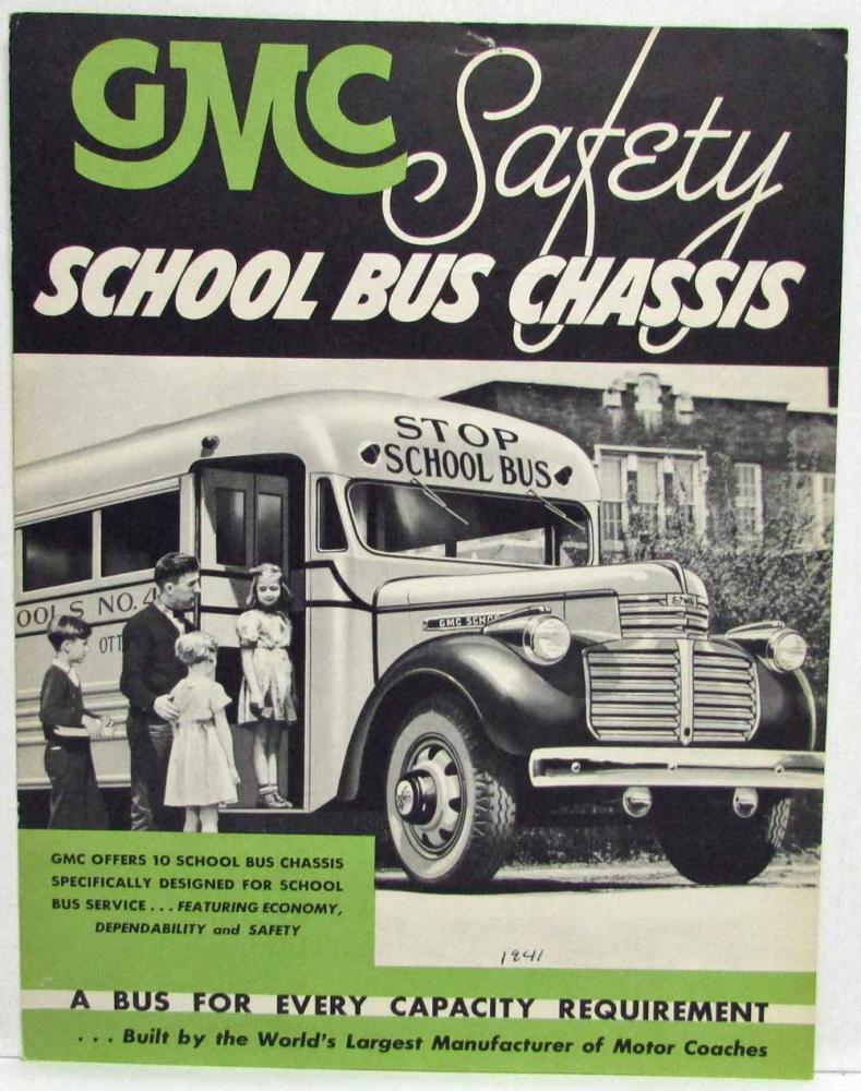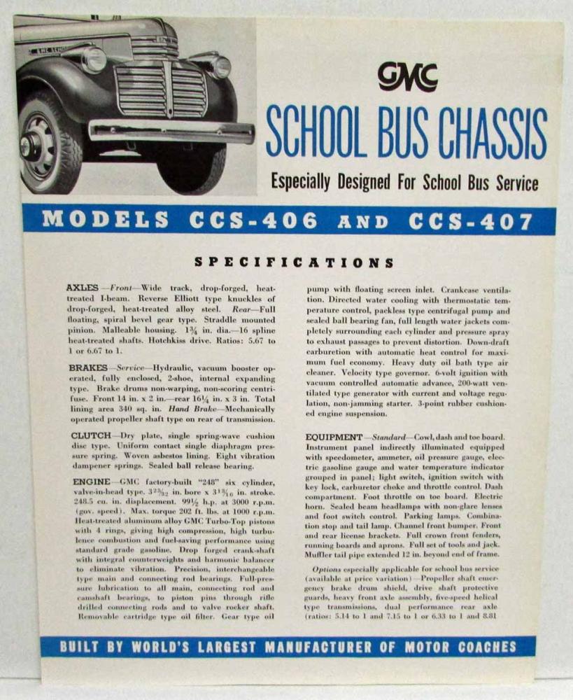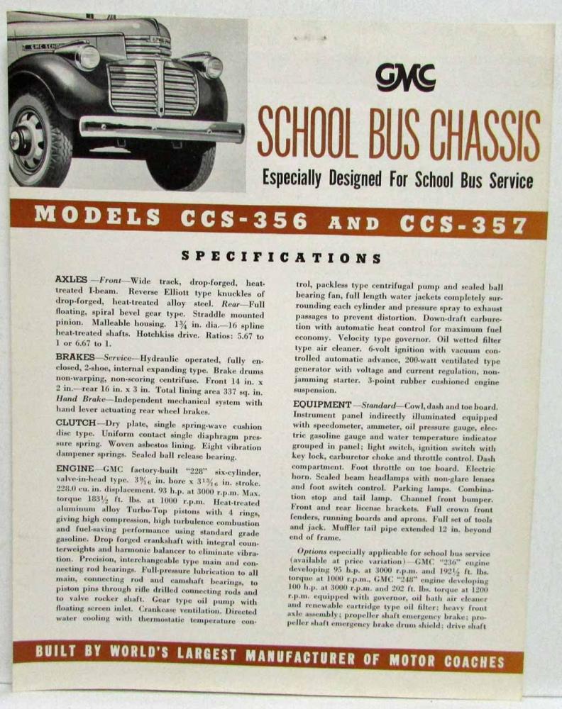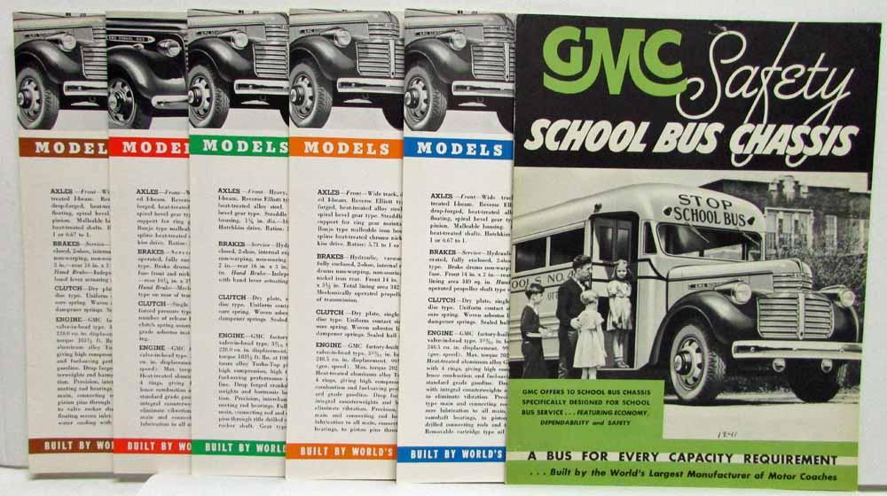 1941 GMC Trucks Safety School Bus Chassis Sales Brochure with 5 Models Spec Sheets. GMC Safety School Bus Chassis. GMC offers 10 school bus chassis specifically designed for school bus service...featuring economy, dependability and safety. A bus for every capacity requirement...built by the world's largest manufacturer of motor coaches. Inside displays some of the features with descriptions. Back highlights GMC built Super-Duty Valve-in-Head Engines. Color coded spec sheets: Green - Models CCS-304 and CCS-305. Brown - Models CCS-356 and CCS-357. Blue - Models CCS-406 and CCS-407. Orange - Models CCS-457 and CCS-458. Red - Models ACS-507 and ACS-508. Condition: 1941 handwritten in ink on cover of brochure. Small tear and holes in cover where you can tell a staple had been at some point. See pics.