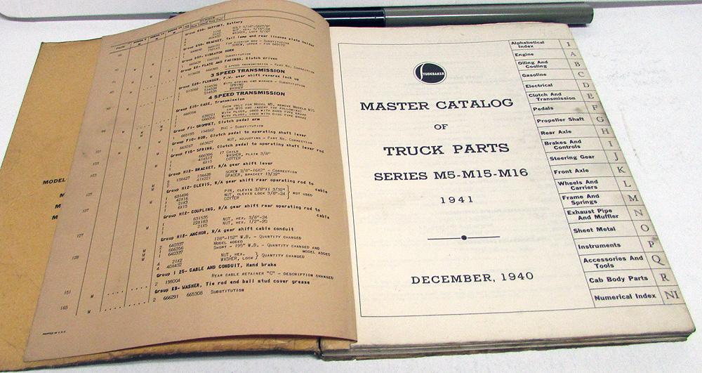 Original 1941 Studebaker Dealer Truck Parts Book. This is what the Dealer used to identify and order the parts to repair your M Series Studebaker Truck. It has Part Numbers, Description, Quantity and some Illustrations. Sections covered are: Engine, Clutch, Fuel System, Exhaust, Cooling, Electrical, Transmission, Propeller Shaft, Rear Axle, Brakes, Front Axle, Steering, Wheels, Frame & Springs, Sheet Metal, Instruments, Accessories, Cab Body. It is in good complete condition with normal wear, blemishing and soiling from use in a Dealership. Very useful tool for Studebaker Owner or Collector.