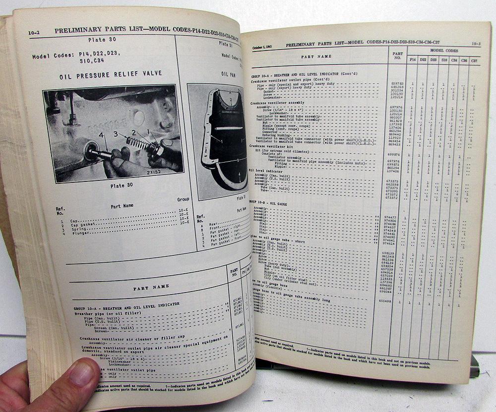 Original 1942 Chrysler, Plymouth, Dodge, De Soto Canadian Dealer Preliminary Parts List [dated October 1, 1941]. This Mopar Parts Book is what the Canadian Dealer used to order available Factory Replacement Parts to repair your P14, D22-D23, S10, C34-C36-C37 Passenger Car Model. The Preliminary Books were sent to Dealers to use until the regular editions were printed. It has an Alphabetical and Numerical Index, Part Numbers, Description, Application, Quantity and Illustrations for the Replacement Parts for these Cars. It is in good condition with minor wear, soiling and blemishing [see photos]. Very informative and rare piece for the Chrysler, Plymouth or Dodge Owner or Collector. Canadian editions are especially hard to find.