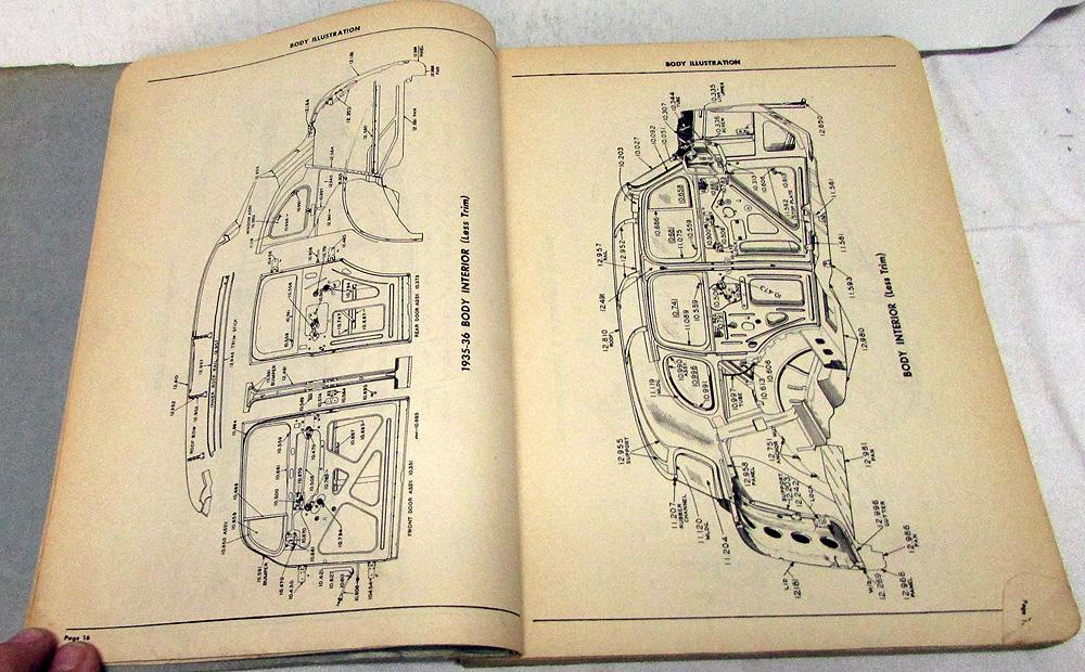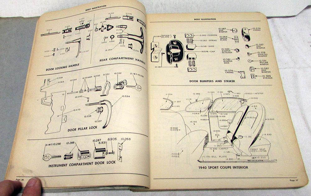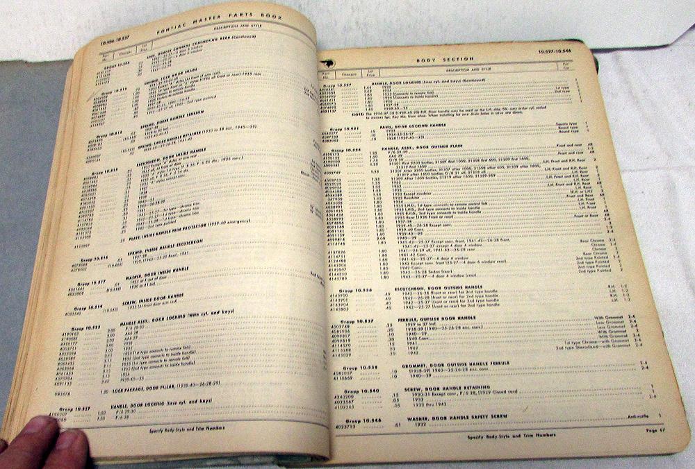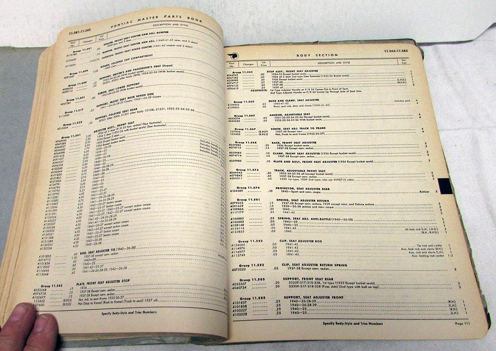 Original 1942 Pontiac Body Parts Book, dated Effective May 1, 1942. This Pontiac Master Body Parts Catalog is what the Dealer used to order available Factory Replacement Parts to repair your Car. Groups covered are: Windshield, Doors, Door Ventilator, Window Regulator, Rear Ventilator, Garnish Molding, Seats, Rear Compartment-Lid, Braces & Brackets, Sheet Metal, Folding Top, Trim Assys, Floor Mats-Carpets. It has Part Numbers, Description, Application, Quantity, List Price and Illustrations. It covers 1942 and some earlier Models. It is in good condition for its age with normal wear and blemishing from use in a Dealership [see photos]. Very rare and informative tool for the Pontiac Owner that will display well.