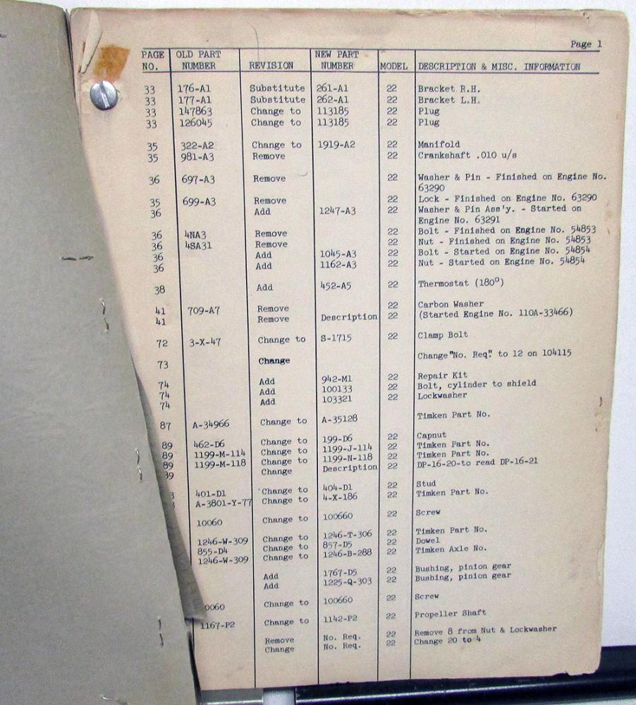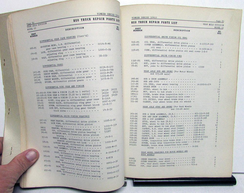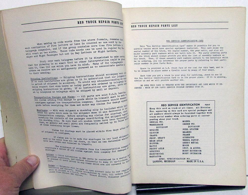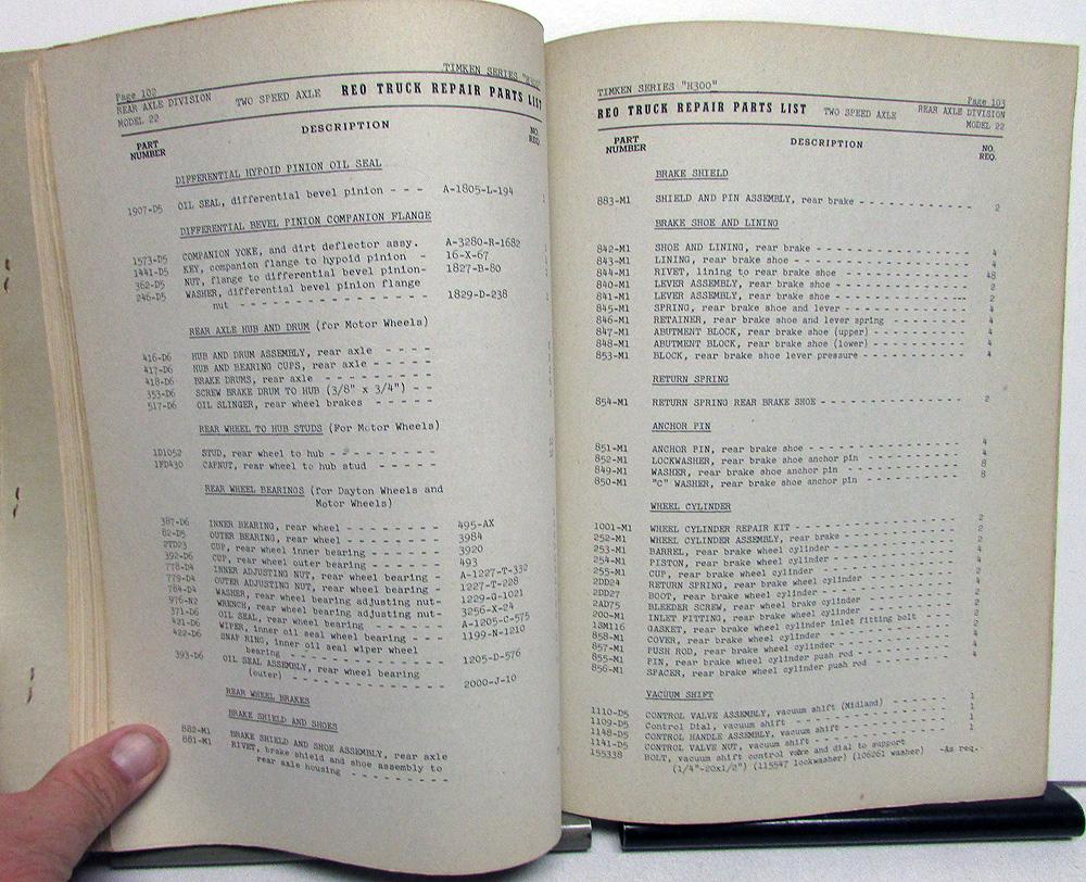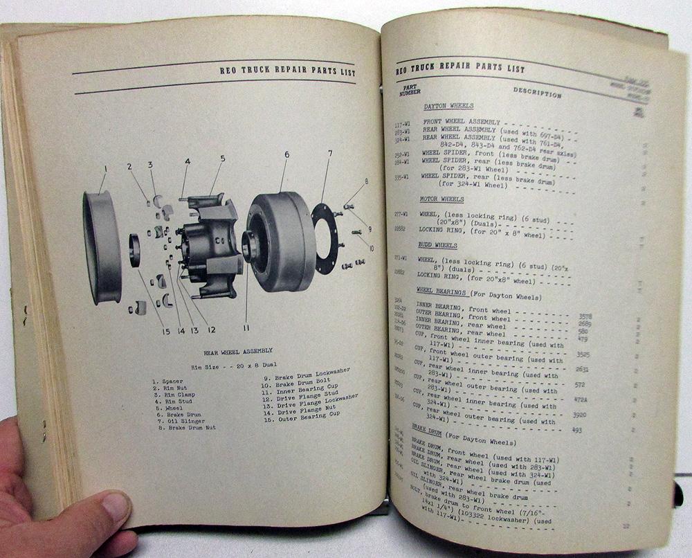 Original 1946-47 REO Speedwagon Trucks Dealer Service Parts Book. This Parts Catalog is what the Dealer used to order available Factory Replacement Parts to repair your Model 22 Truck with Serial Numbers between 26391 and 49999. It shows Part Numbers, Description, Quantity and some Illustrations for these Parts. It is in good condition for its age with some wear and blemishing from use in a Dealership [see photos]. Very rare and informative piece for the REO Owner or Collector.