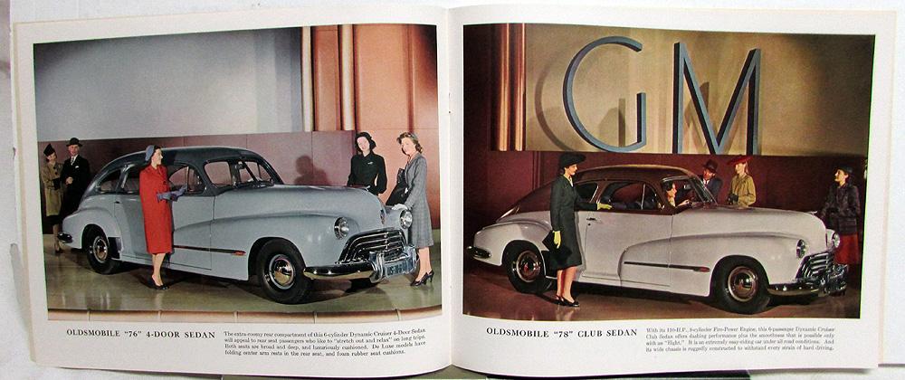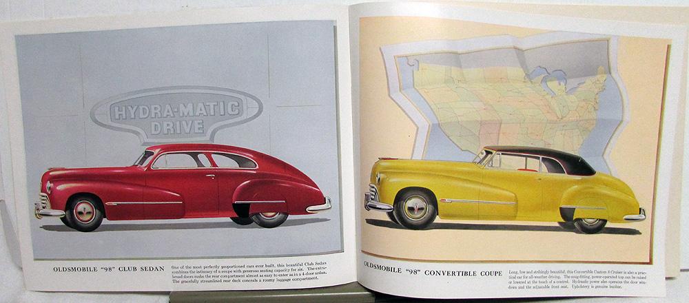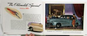 Original over-sized, color, sales brochure for the Oldsmobile 1946 Special series 66, Dynamic Cruiser series 76 - 78, and Custom 8 Cruiser series 98 models. Illustrations and photos with captions, text, and specifications for the 66, 76 - 78, and 98 series. Good condition for its age with minor wear and discoloration [see photos].