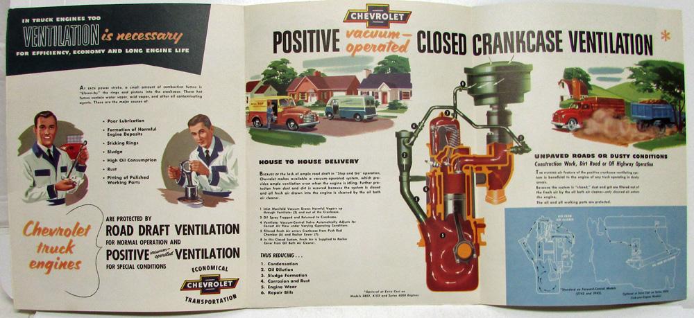 1947 Chevrolet Ventilation is Important Sales Folder. Ventilation is important. Ventilation is necessary for efficiency, economy and long engine life. Ventilation by road draft for highway or average city hauling. Positive vacuum-operated closed crankcase ventilation. A well ventilated truck engine saves money in any operation.