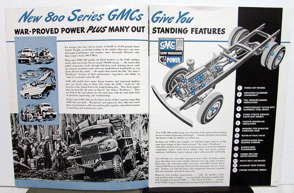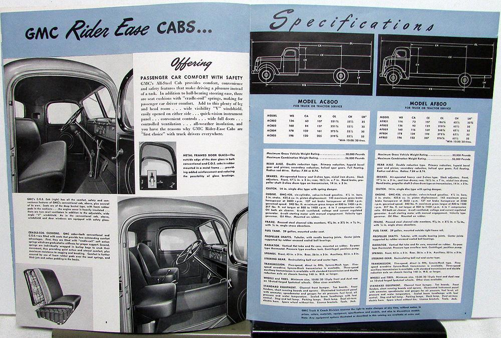 1948 GMC Trucks "New Series 800" original, sales brochure featuring lots of photos and illustrations. Includes chassis and features. Specifications and dimensions for the models: AC800, AF800, AC850, AF850, ACW800, and ACW850. Good condition with minor wear and soiling [see photos]. Printed 5-48.