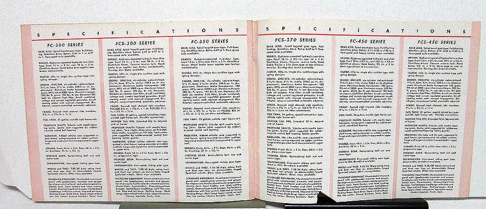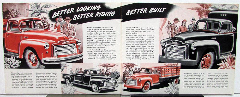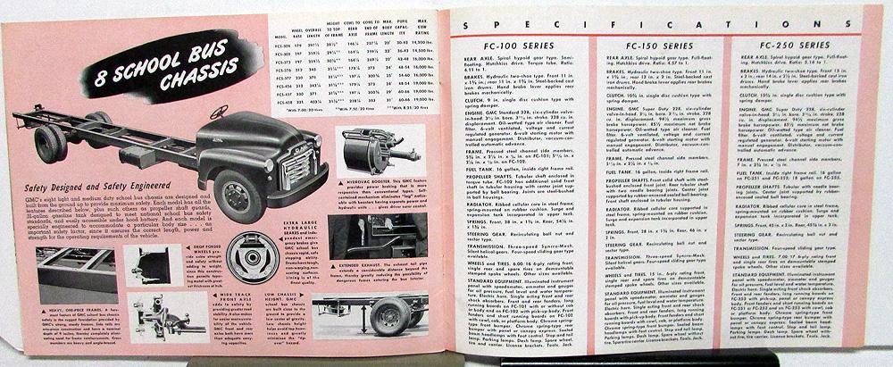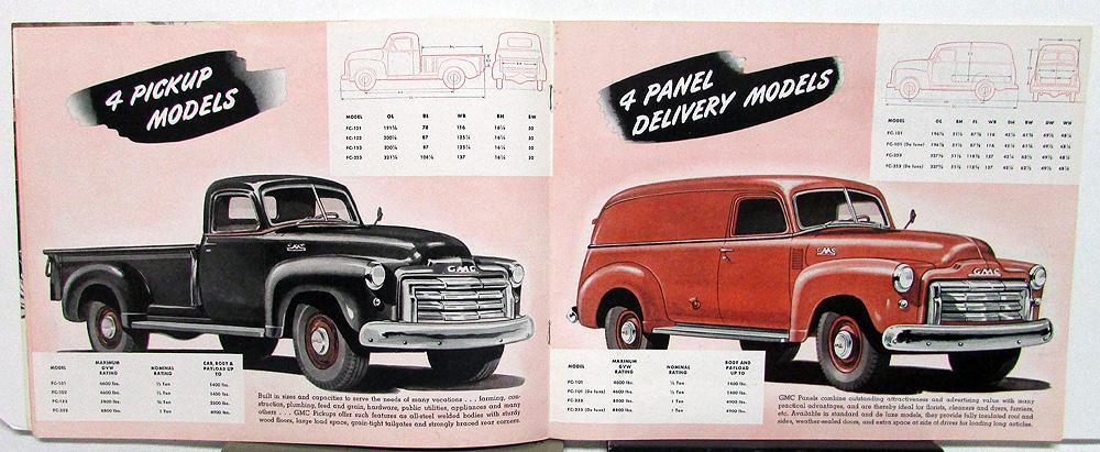 1948 GMC Trucks In the 100 Through 450 Series, original, sales brochure. Contains photos and illustrations. Information on cabs, workhorse engine design, construction, axle options, chassis, etc. Models covered with specs include FC-100, FC-150, FC-250, FC-300, FCS-300, FC-350, FCS-370, FC-450, and FCS-450 Series. Illustrated models with dimensions and captions include: pickups, delivery, express, stake, platform, tractor, medium duty chassis for heavier hauling, milk delivery, suburban, and school bus chassis. Good condition with minor wear and soiling [see photos]. Back cover has a small tear at bottom.