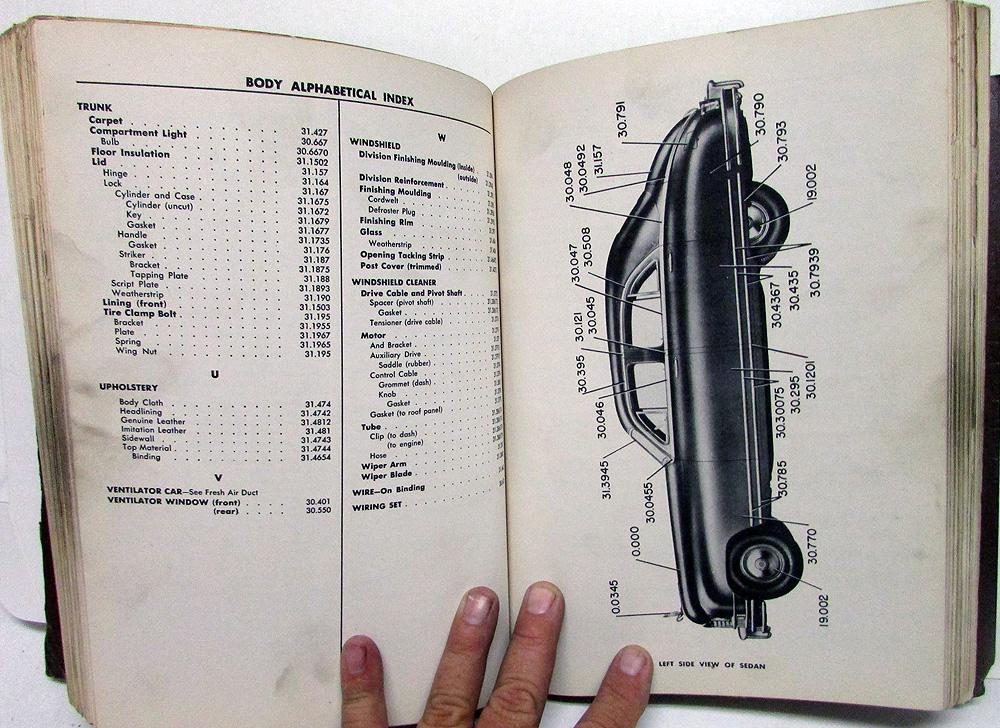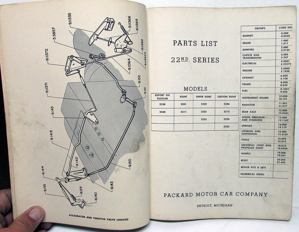 Original 1948 Packard Dealer Parts List. This Parts Book dated December, 1948 covers the 22nd Series Packard Models and includes both the Chassis and Body Sections. This is what the Dealer would have used to order Factory Replacement Parts to repair your Car. It shows Part Numbers, Descriptions, Quantity and Illustrations for the available Factory Replacement Parts. It is in good condition with normal wear and blemishing from use in a Dealership [see photos]. Very rare and useful tool for the Packard Owner or Collector.