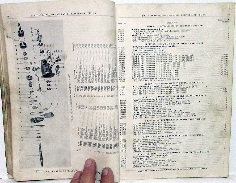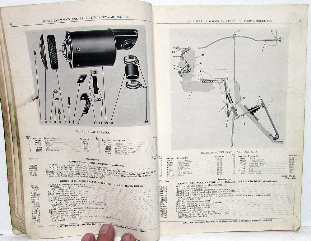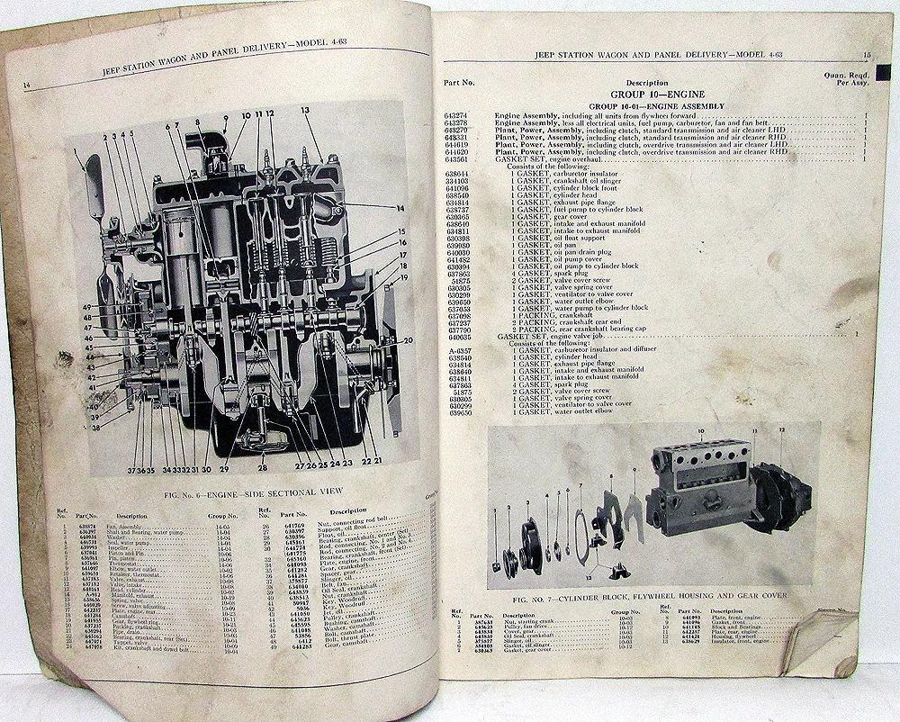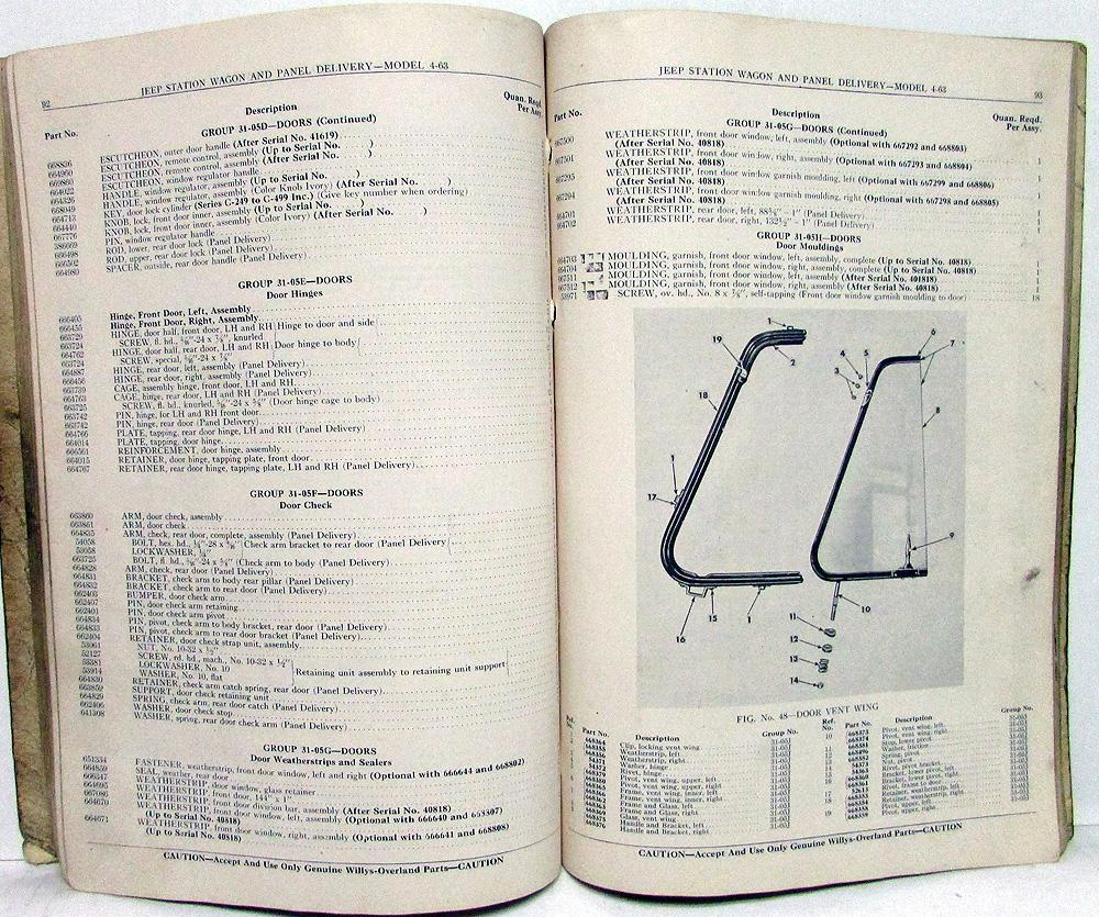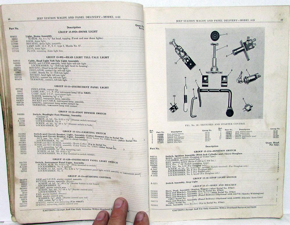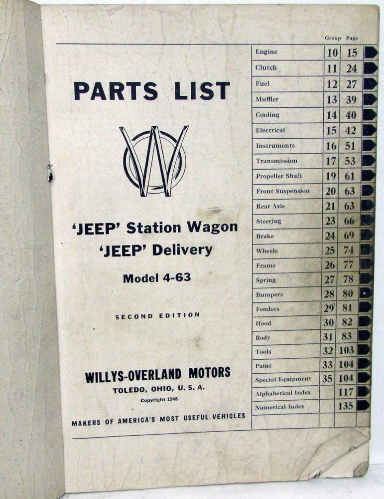 Original 1948 Willys Jeep Dealer Parts List. This Parts Book [Second Edition, Copyright 1948] covers the Station Wagon and Panel Delivery 4-63 Models. It has Part Numbers, Group Numbers, Description, Quantity and Illustrations for the Replacement Parts that were available from the Factory. This is what the Dealer used to order parts to repair your Jeep. It is in good condition for ita age with normal wear, soiling and blemishing from use in a Dealership [see photos]. Very useful tool for the Jeep Owner that is hard to find.