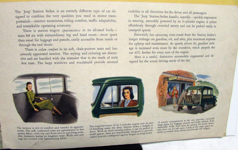 Original 1948 Jeep Dealer Sales Brochure. This large color Folder highlights the Features of the Jeep Station Wagon Sedan Models. It is in fair condition with some wear, soiling and blemishing [see photos]. Very rare Willys Jeep piece that will be a good addition to any Collection.