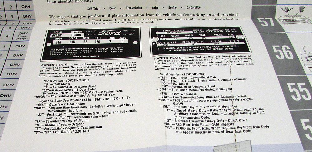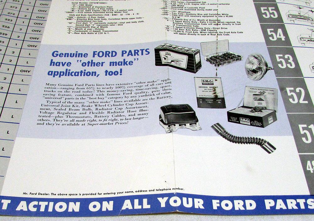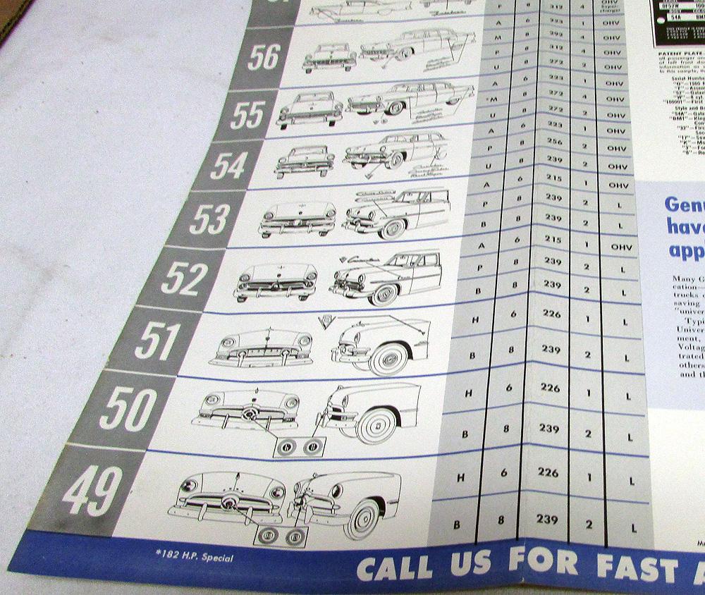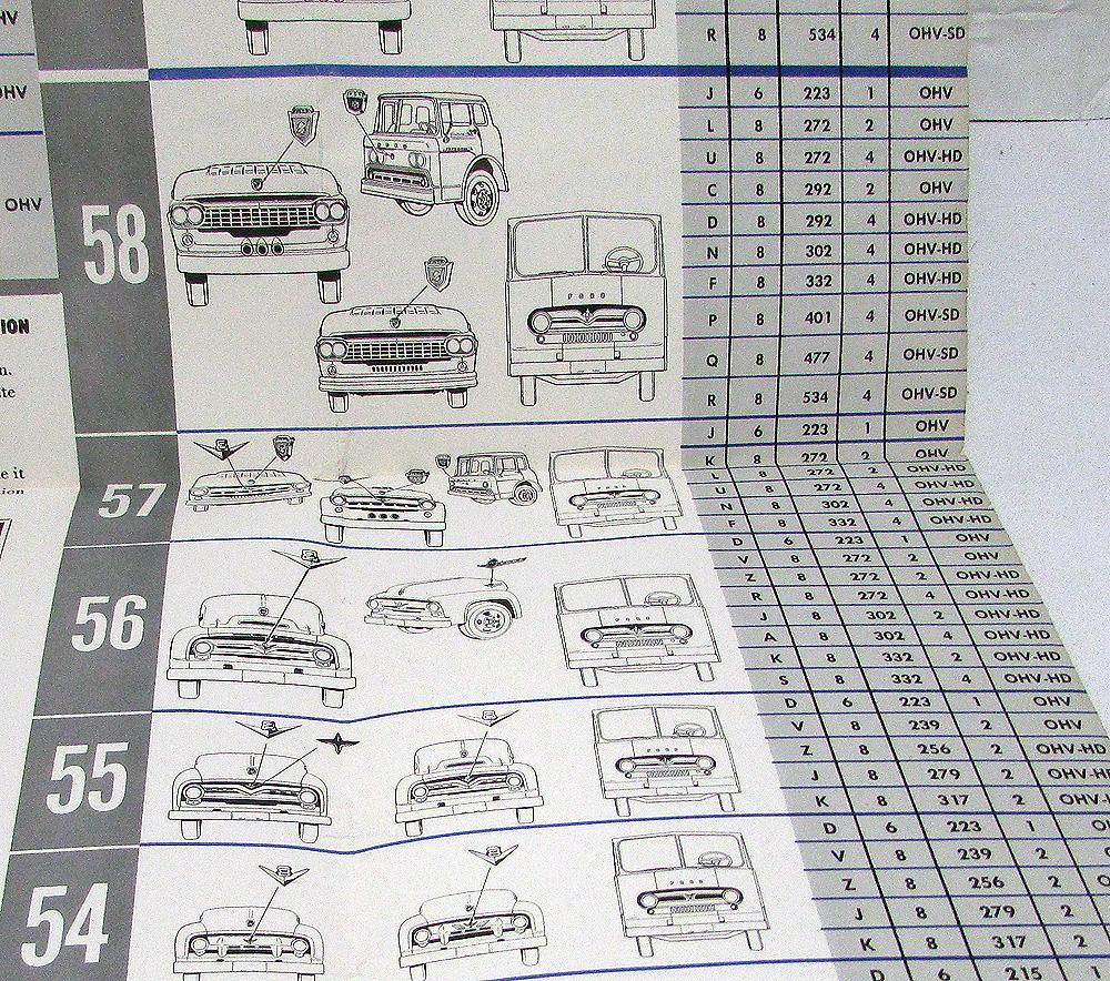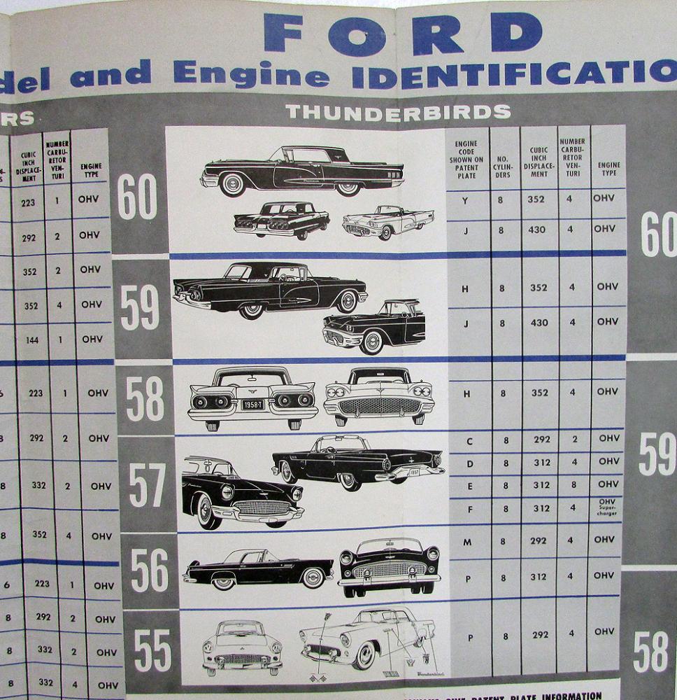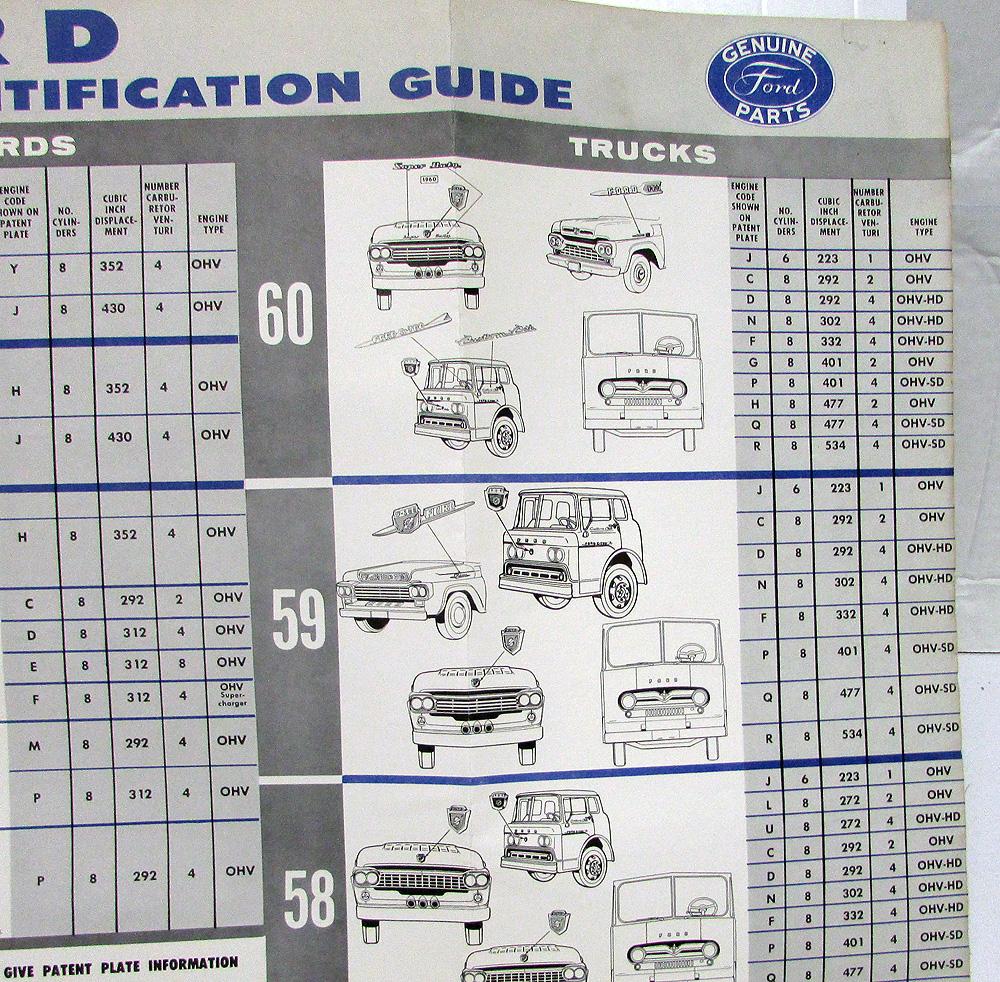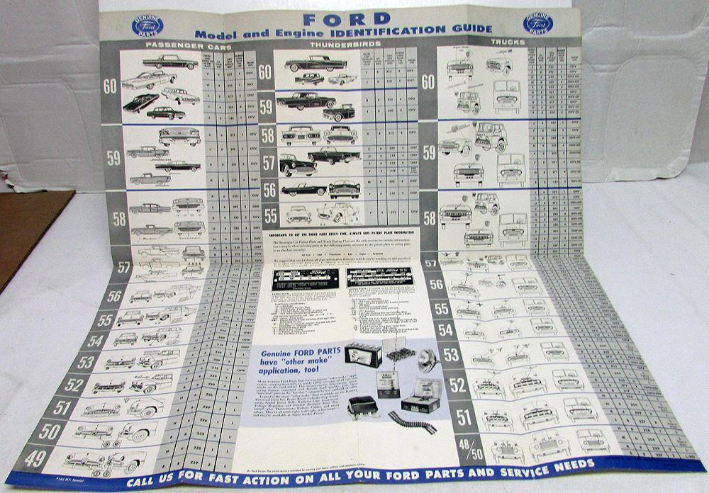 Original Ford Dealer Service/Parts Department Poster. This large Poster is a 1949-60 Model and Engine Identification Guide. It shows Body Views with distinguishing Emblems for Passenger, Thunderbird and Truck Models for this period. It also shows Engine Codes from Patent Plate with Specs. It is in good condition with minor wear, soiling and blemishing [see photos]. It has creases from being folded but will make a great framed display piece. Very informative and cool piece that will be a great addition to any Collection.