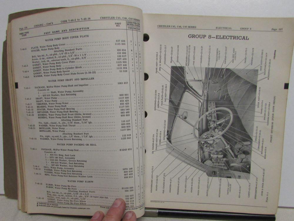 This parts list is supplied for your convenience in identifying, specifying, and ordering service replacement parts for Chrysler Cars (C45, C46, C47). Note: Parts List/Books, much like service manuals, can be valuable tools when working on and/or restoring a vehicle. For the uninitiated, keep in mind that these manuals were never meant as restoration manuals, as that is not within the regular scope of work done by dealership service departments (even today).