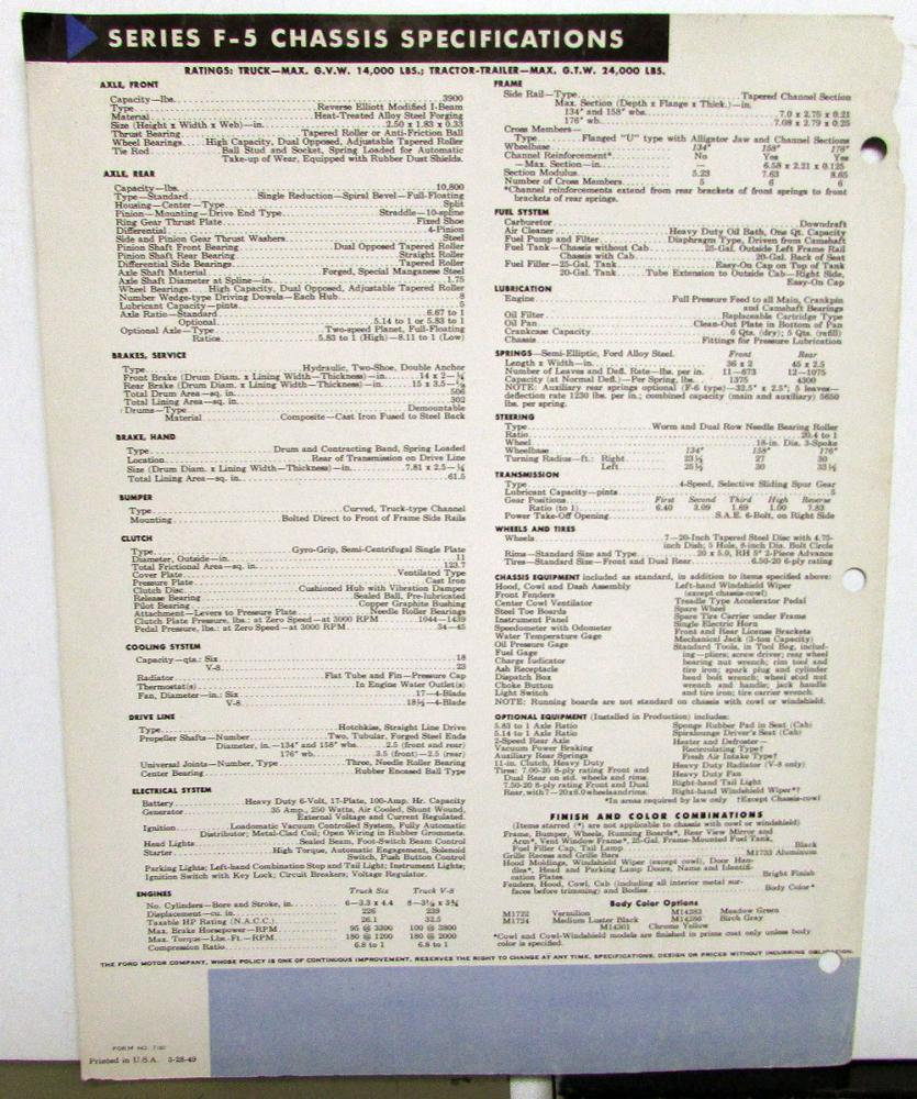 Series F-5 1949 Ford Heavy Duty Trucks, Original, dealer sales brochure form no. 7180 3-28-49 measures 8.5 x 11 with 4 pages and is punched for a three-ring binder. Details of engine, chassis dimensions, and specifications. Good condition for its age with some wear and blemishing [see photos]. Upper left corner of spine is damaged.