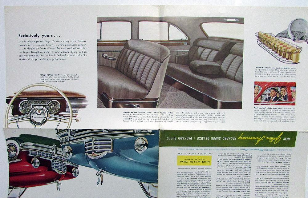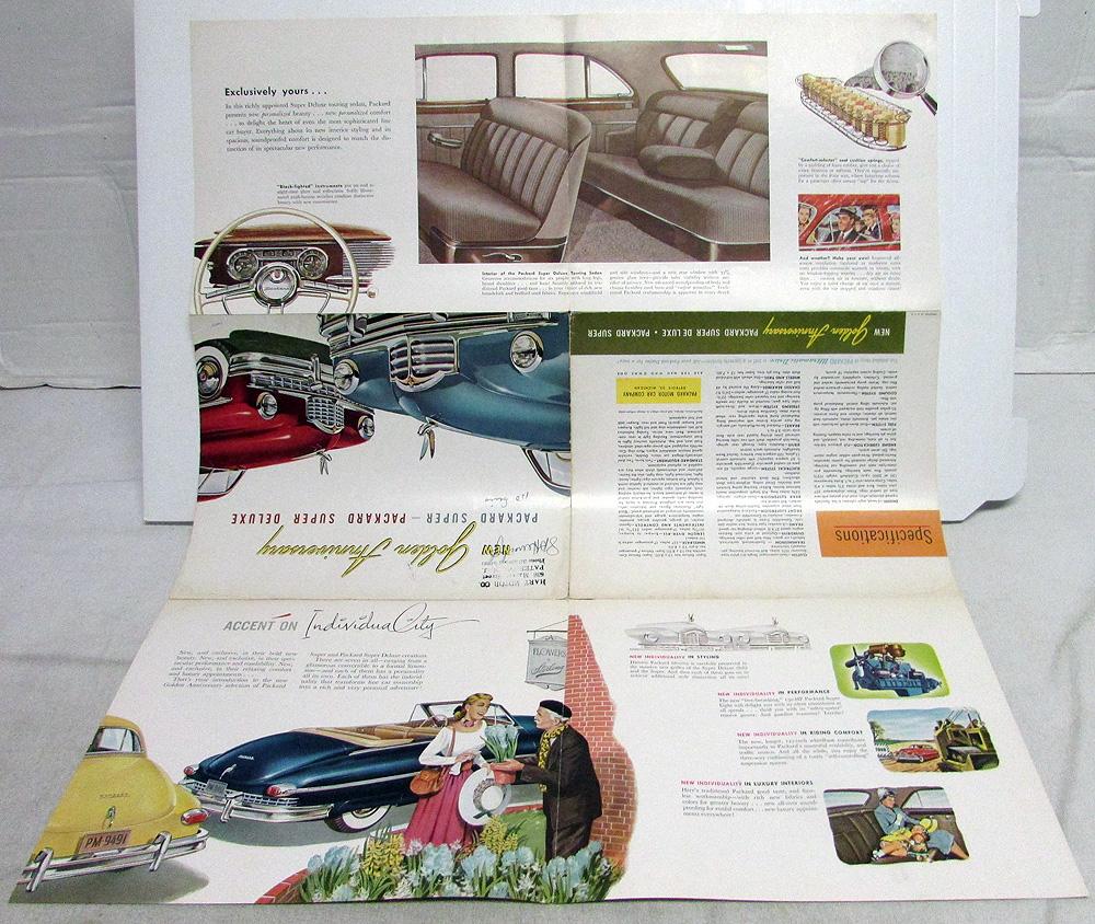 Original 1949 Packard Dealer Color Sales Brochure. This large and well illustrated Folder highlights the Packard Super & Super DeLuxe Golden Anniversary Models. It is in good condition for its age with minor wear, blemishing and soiling [see photos]. It has a Dealer Stamp and writing on front cover.