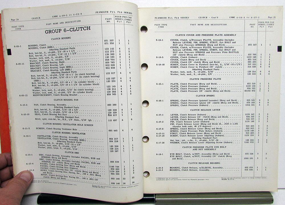 Original 1949 Plymouth Dealer Advance List of Parts [issued Feb. 1949, D-12553]. This Advance Parts Book was sent to Dealers to use until the regular Parts Book was printed. This is what the Dealer used to order Factory Replacement Parts to repair your Model Series P-17 & P-18 Car. It shows Part Numbers, Description, Application and Quantity but does NOT have any Illustrations. Good condition for its age with minor wear and blemishing [see photos]. Cover is loose from spine.