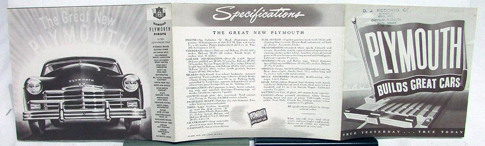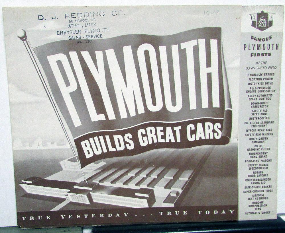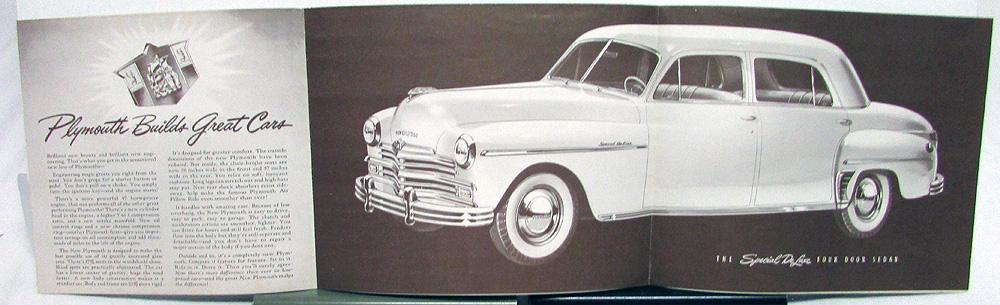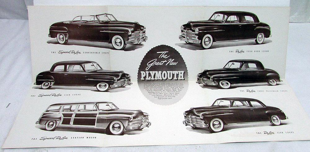 Original 1949 Plymouth Dealer Sales Brochure. This well illustrated Browntone Folder highlights the Special De Luxe and De Luxe Models, including the Woody Station Wagon. It is in good condition with minor wear and blemishing [see photos]. Front cover has a Dealer Stamp. Very rare and informative piece of automotive history that will display well.