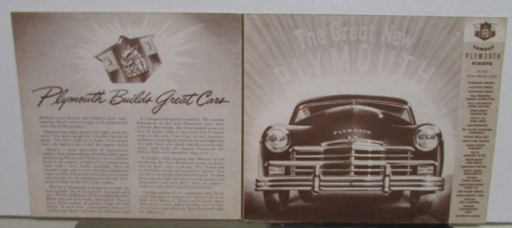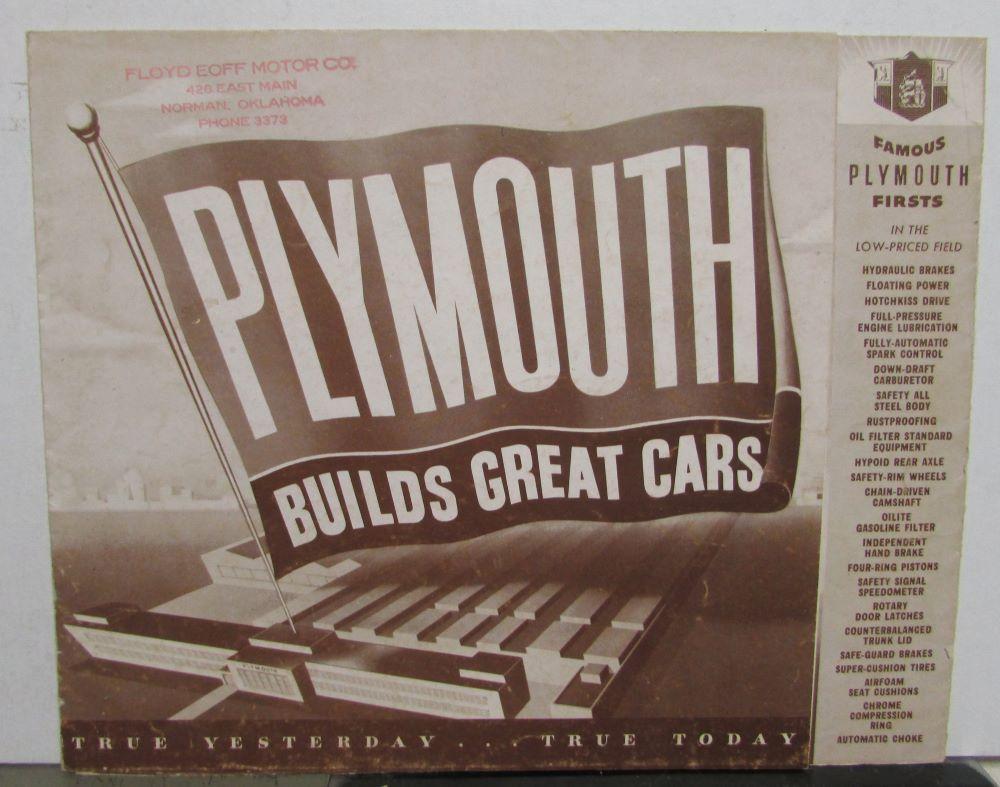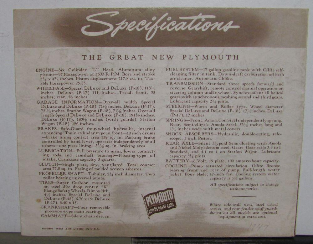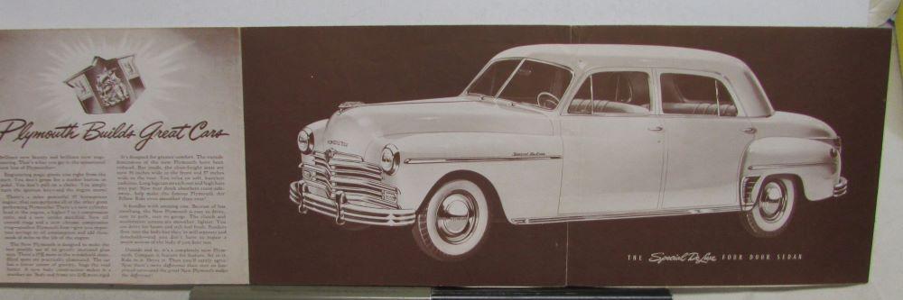 Original 1949 Plymouth Dealer Sales Brochure/FOLDER. This well illustrated Browntone Folder highlights the Special De Luxe and De Luxe Models, including the Woody Station Wagon. It is in good condition for its age with minor wear, soiling and front cover has a Dealer Stamp. Very rare and informative piece of automotive history that will display well. This is different because there is a notation on the back cover about the white side-wall tires, steel wheel covers.